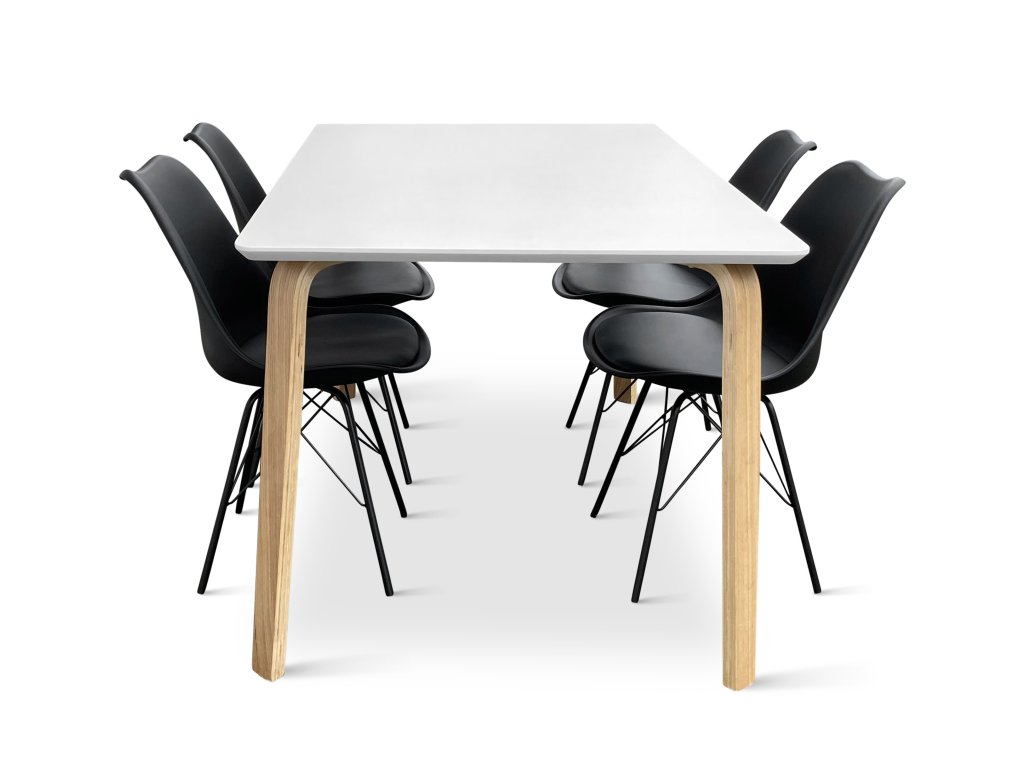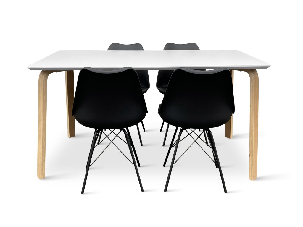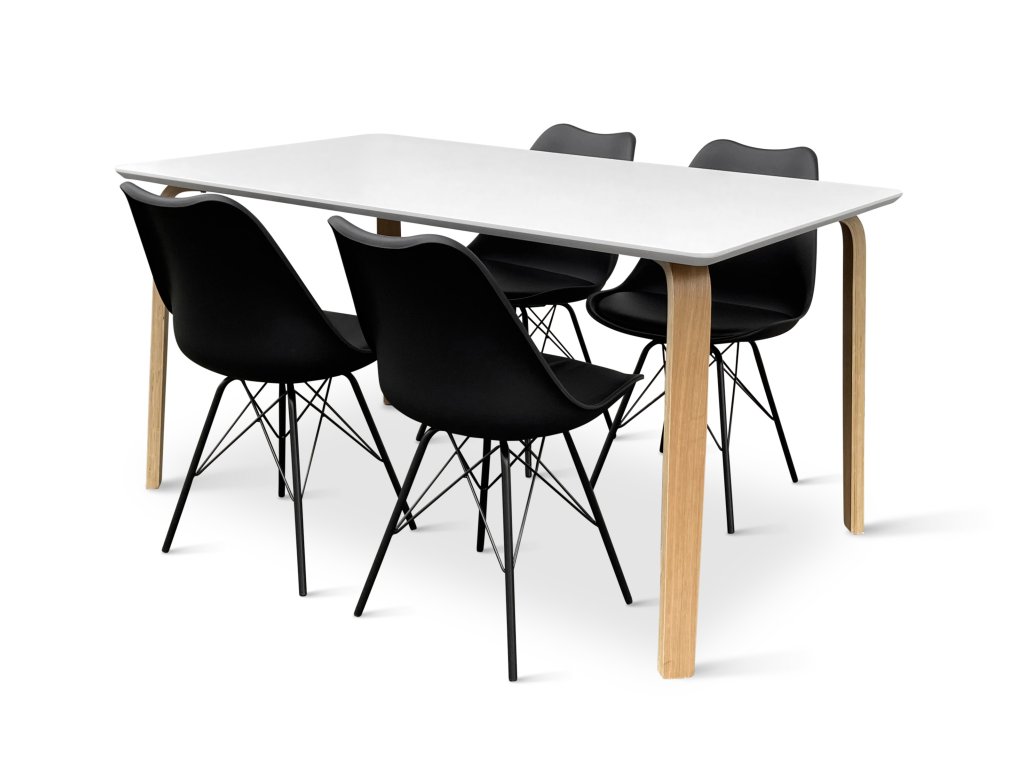 Jídelní set tvoří Dřevěný jídelní stůl Zaha s bílou deskou 150x90 cm a 4x Moderní jídelní židle Eco černá.