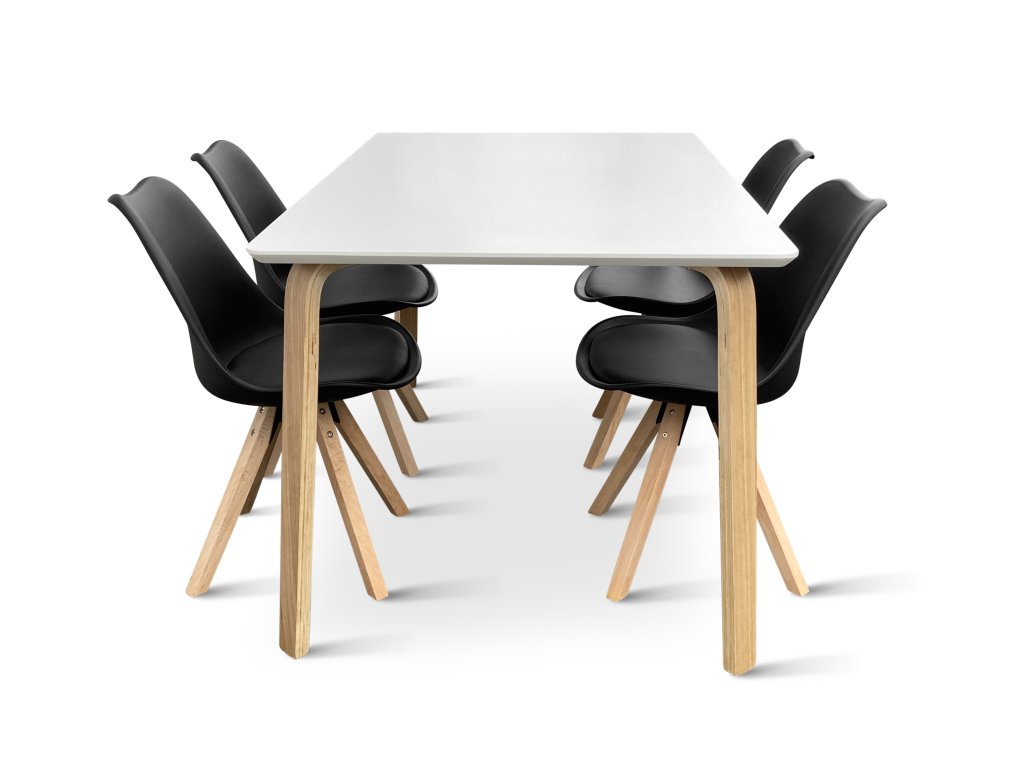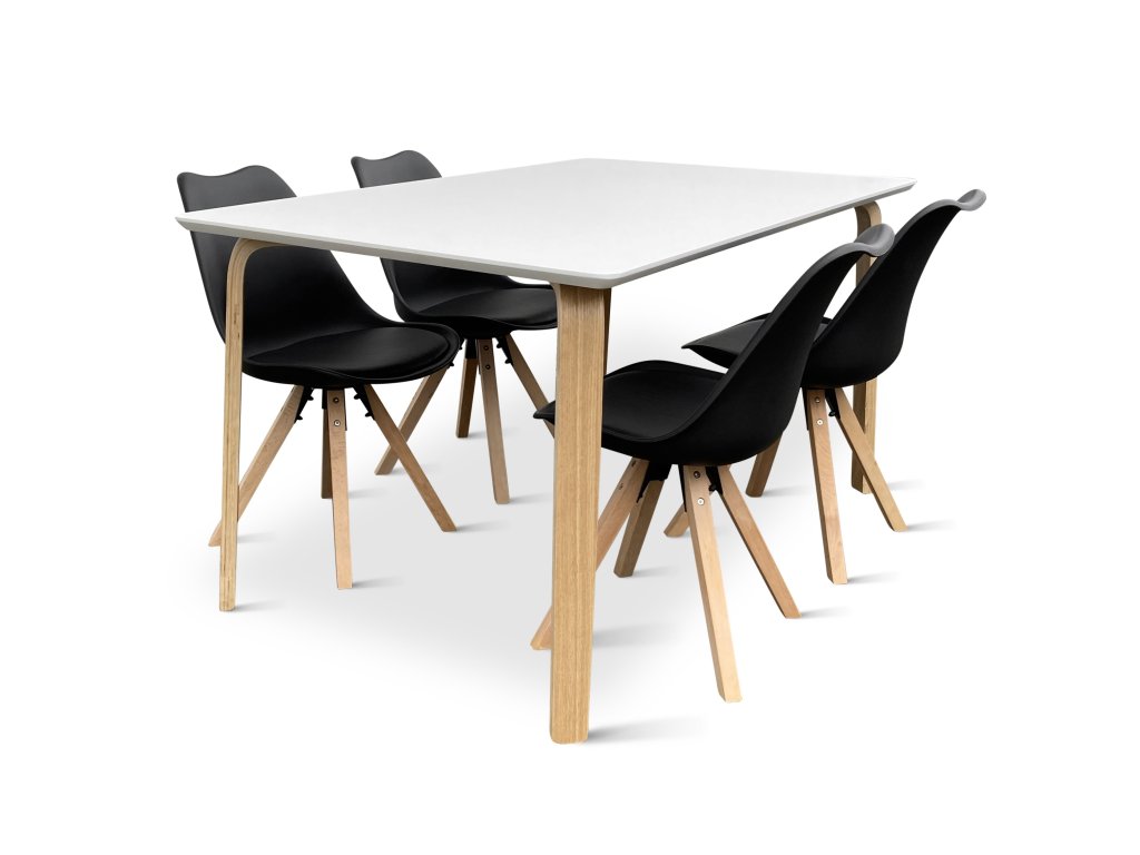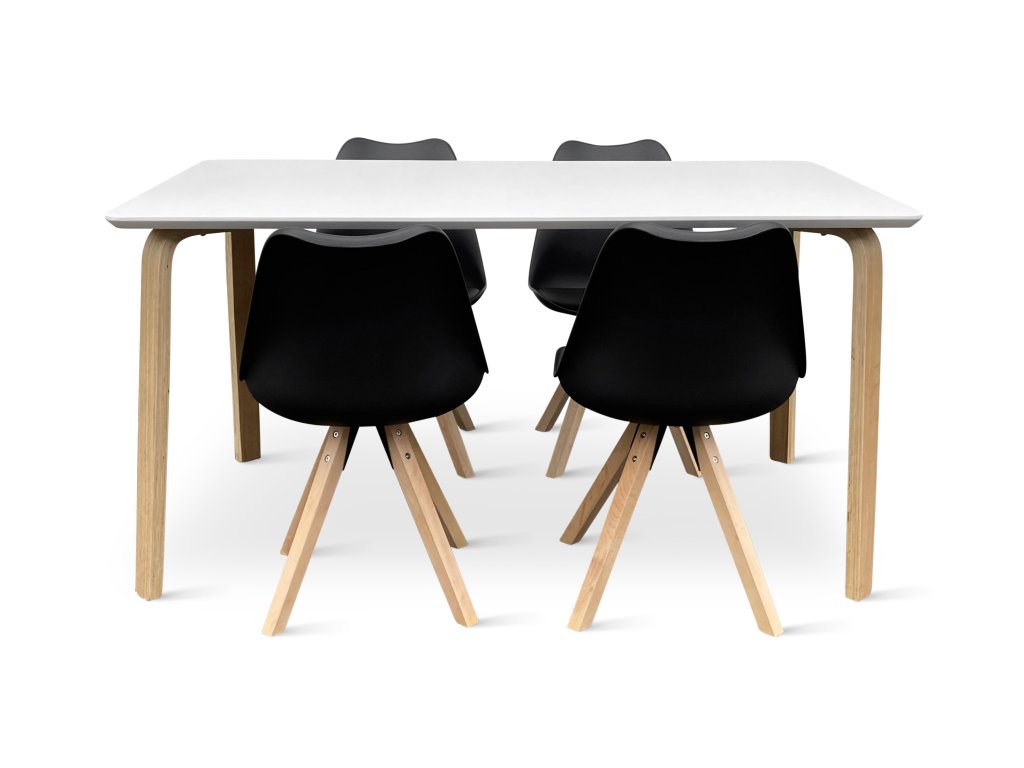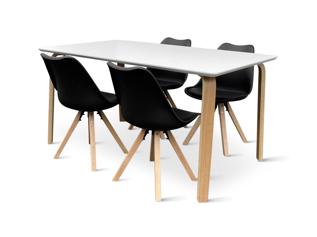 Jídelní set tvoří Dřevěný jídelní stůl Zaha s bílou deskou 150x90 cm a 4x Jídelní židle Gina černá.