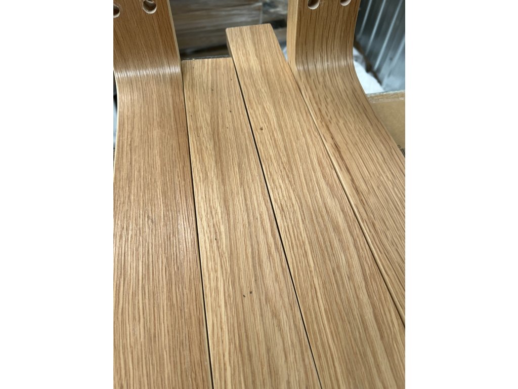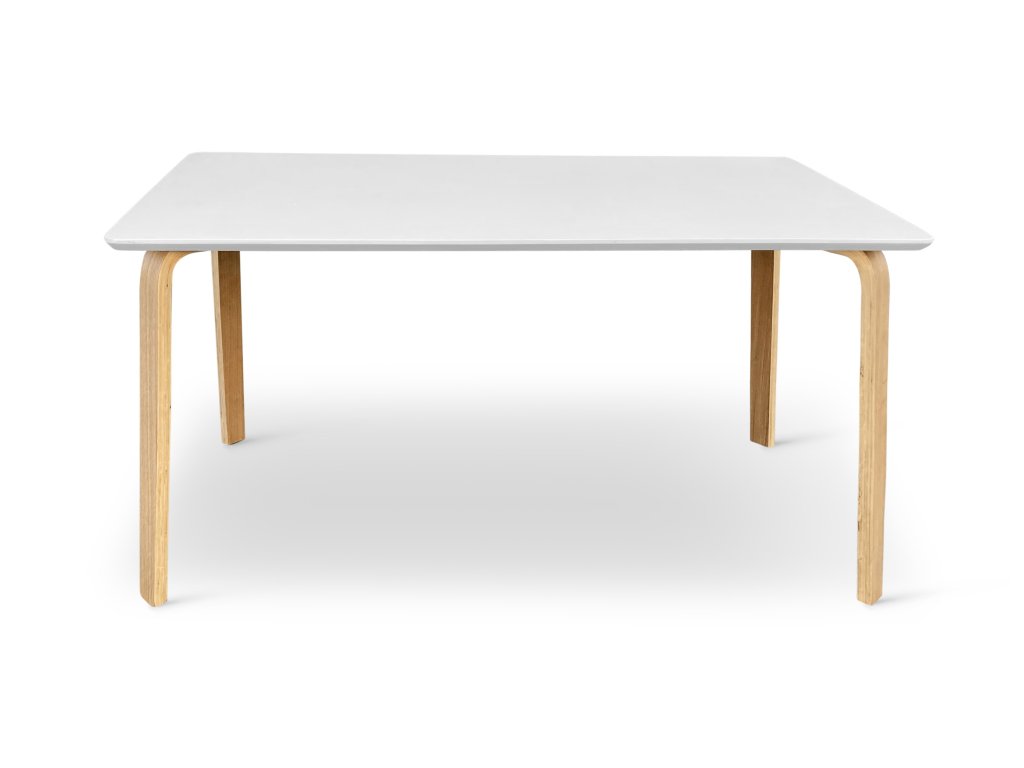 Obdélníkový jídelní stůl o rozměrech 150 x 90 cm vhodný pro 6 osob. Deska stolu v bílé barvě byla vyrobena z dřevovláknité desky natírané práškovou barvou. Jedná se o cenově dostupnější materiál než masivní dřevo. Moderní vzhled stolu umocňují zahnuté nohy z masivního dubu připevněné ke spodní straně desky.