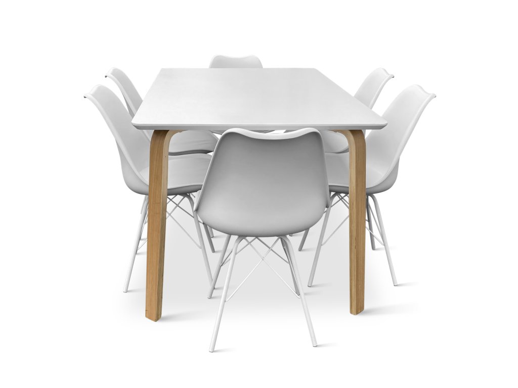 Jídelní set tvoří Dřevěný jídelní stůl Zaha s bílou deskou 150x90 cm a 6x Moderní jídelní židle Eco bílá.