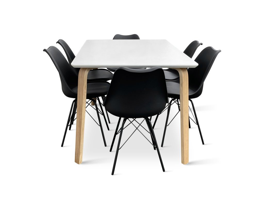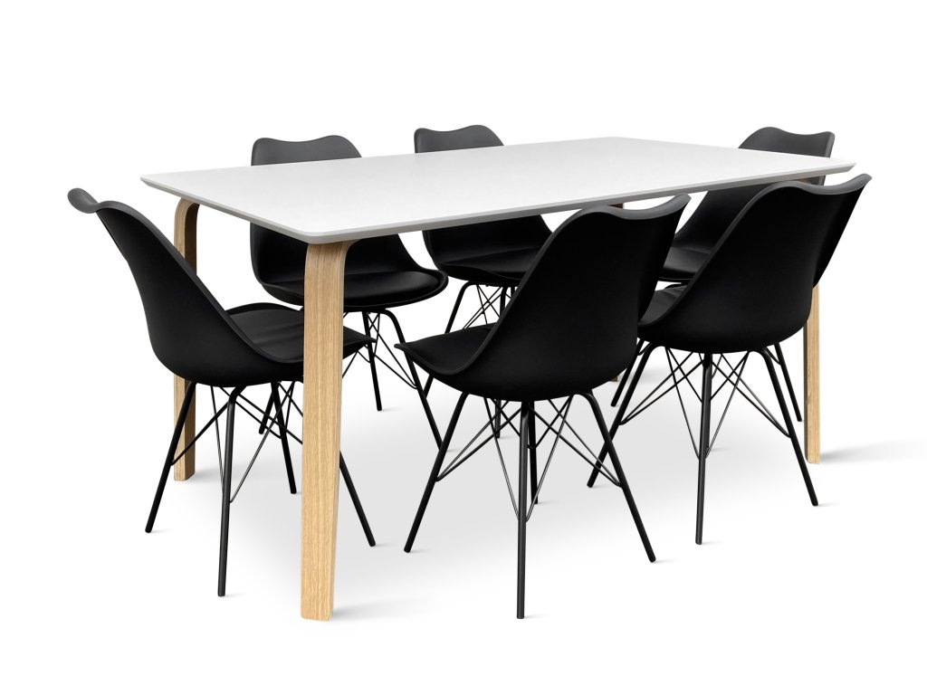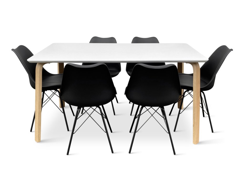 Jídelní set tvoří Dřevěný jídelní stůl Zaha s bílou deskou 150x90 cm a 6x Moderní jídelní židle Eco černá.