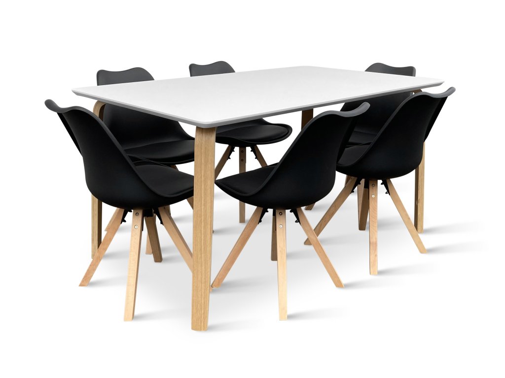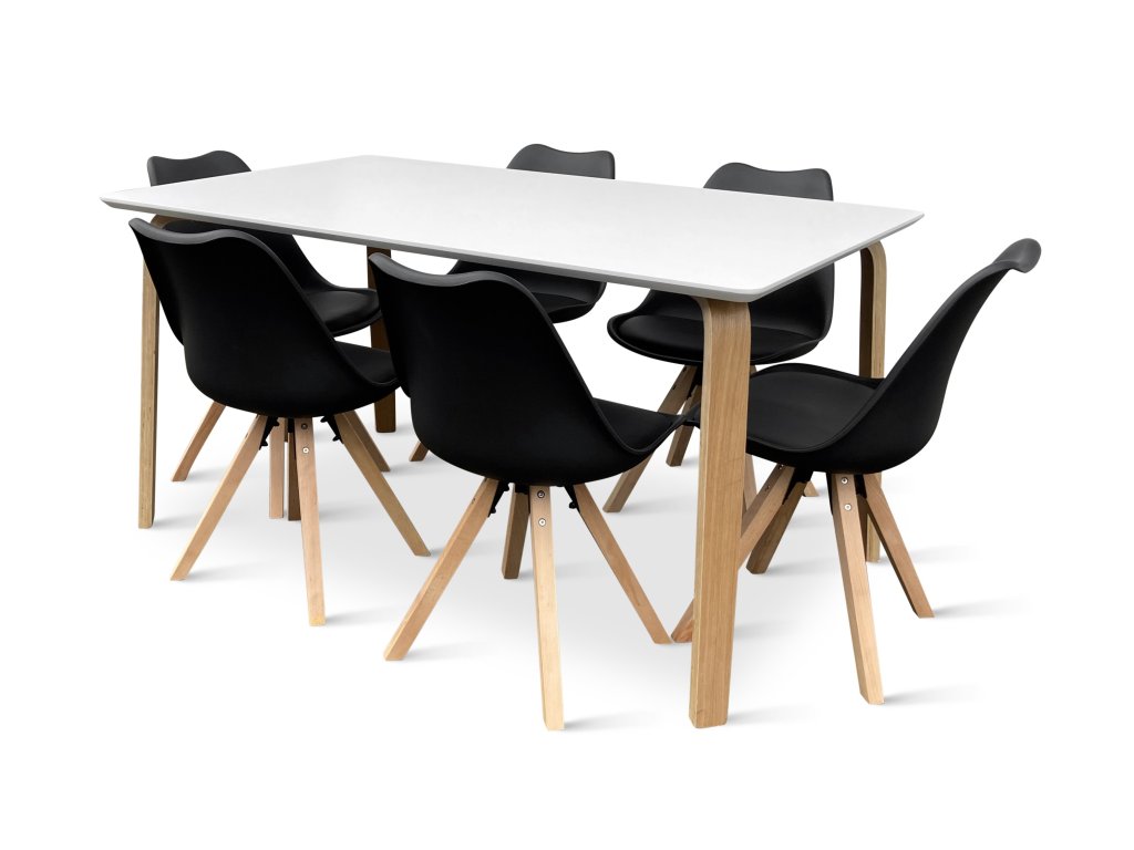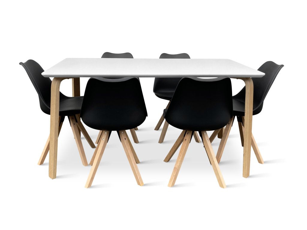 Jídelní set tvoří Dřevěný jídelní stůl Zaha s bílou deskou 150x90 cm a 6x Jídelní židle Gina černá.