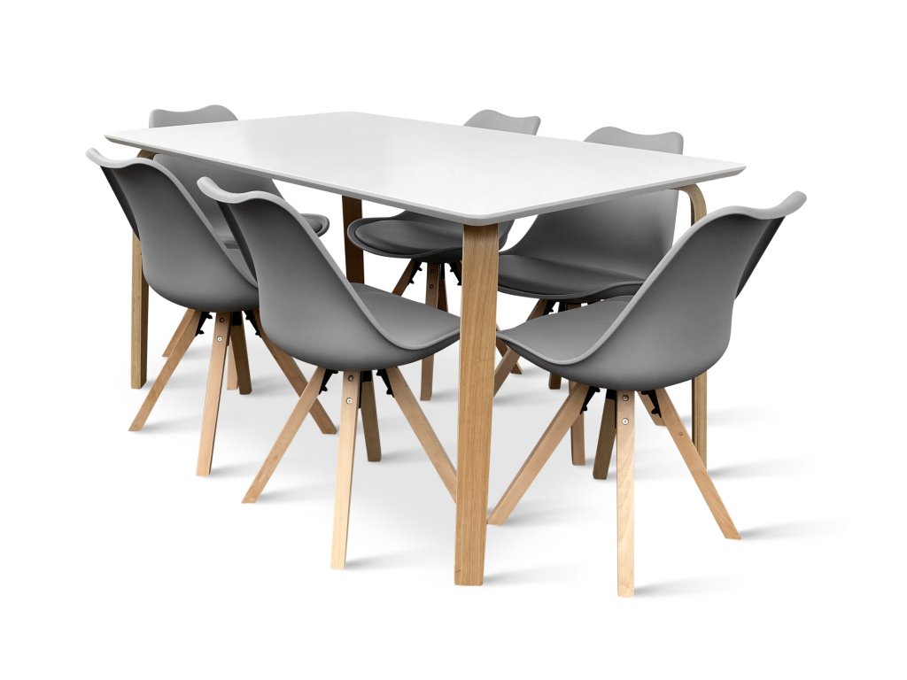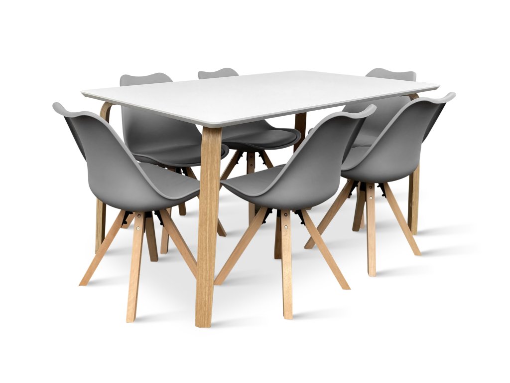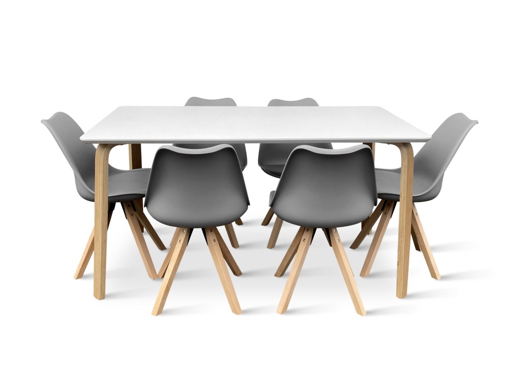Jídelní set tvoří Dřevěný jídelní stůl Zaha s bílou deskou 150x90 cm a 6x Jídelní židle Gina šedá.