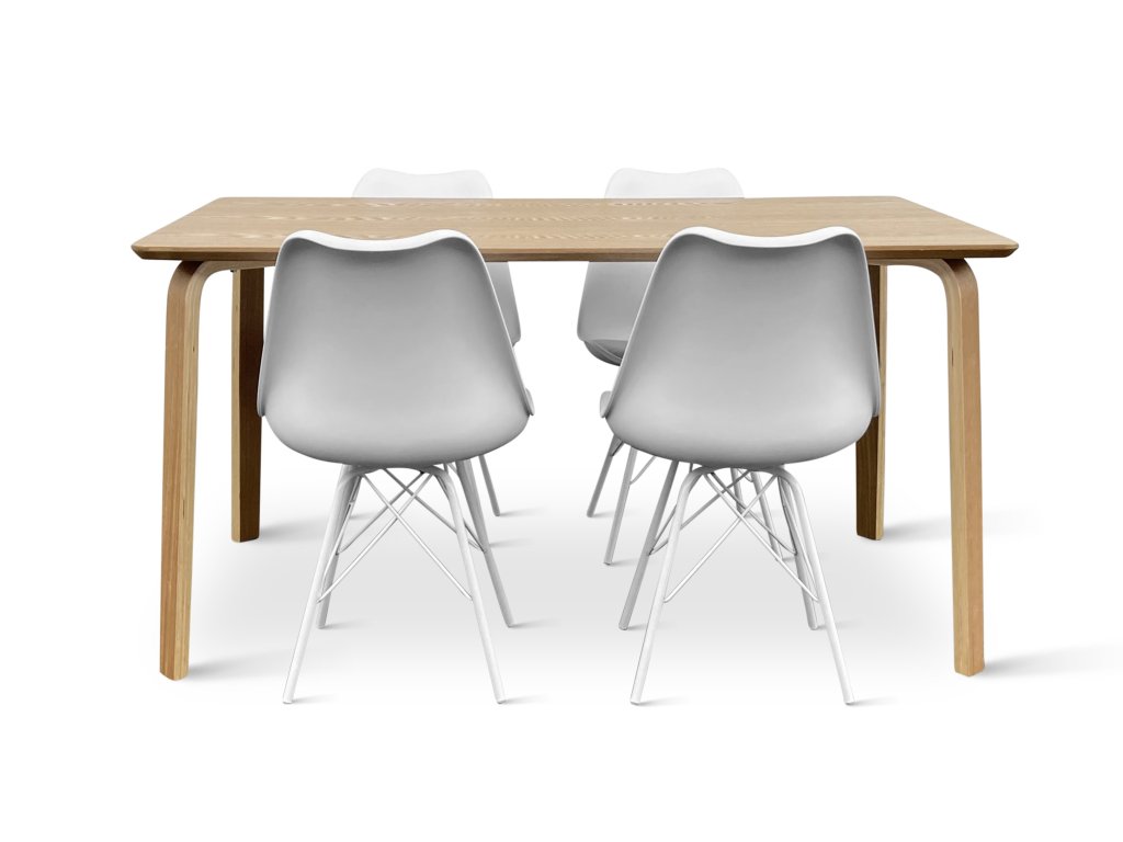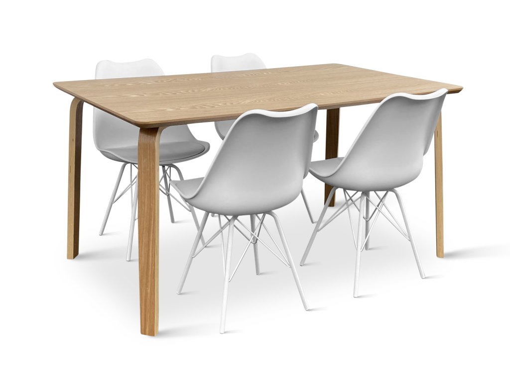 Jídelní set tvoří Dřevěný jídelní stůl Zaha v dekoru dubu 150x90 cm a 4x Moderní jídelní židle Eco bílá.