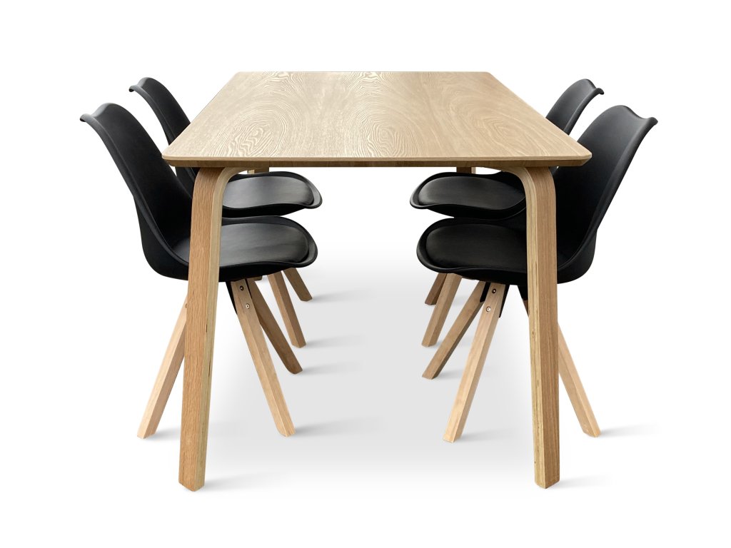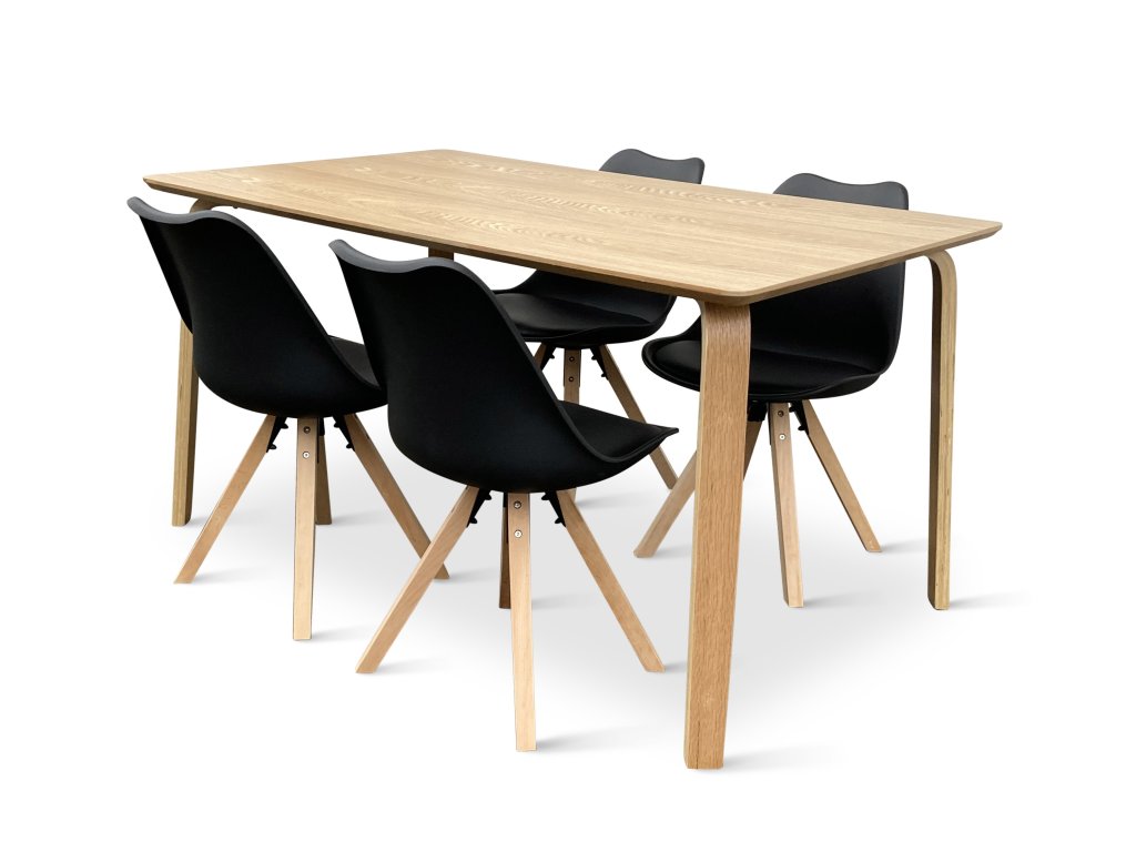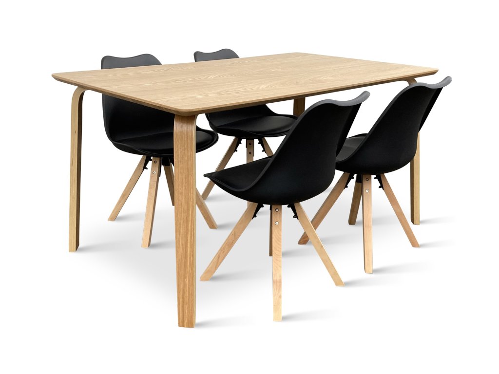 Jídelní set tvoří Dřevěný jídelní stůl Zaha v dekoru dubu 150x90 cm a 4x Jídelní židle Gina černá.