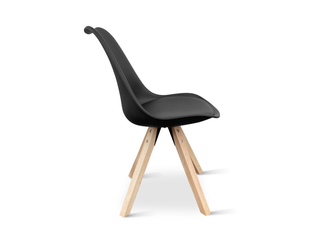 Jídelní stůl doplňují 4 černé židle v jednoduchém skandinávském designu. Sedák a opěrku tvoří odolná plastová skořepina připevněná na 4 nohách z masivního bukového dřeva, které dávají židli patřičnou stabilitu. Pohodlná díky sedáku z eko kůže.