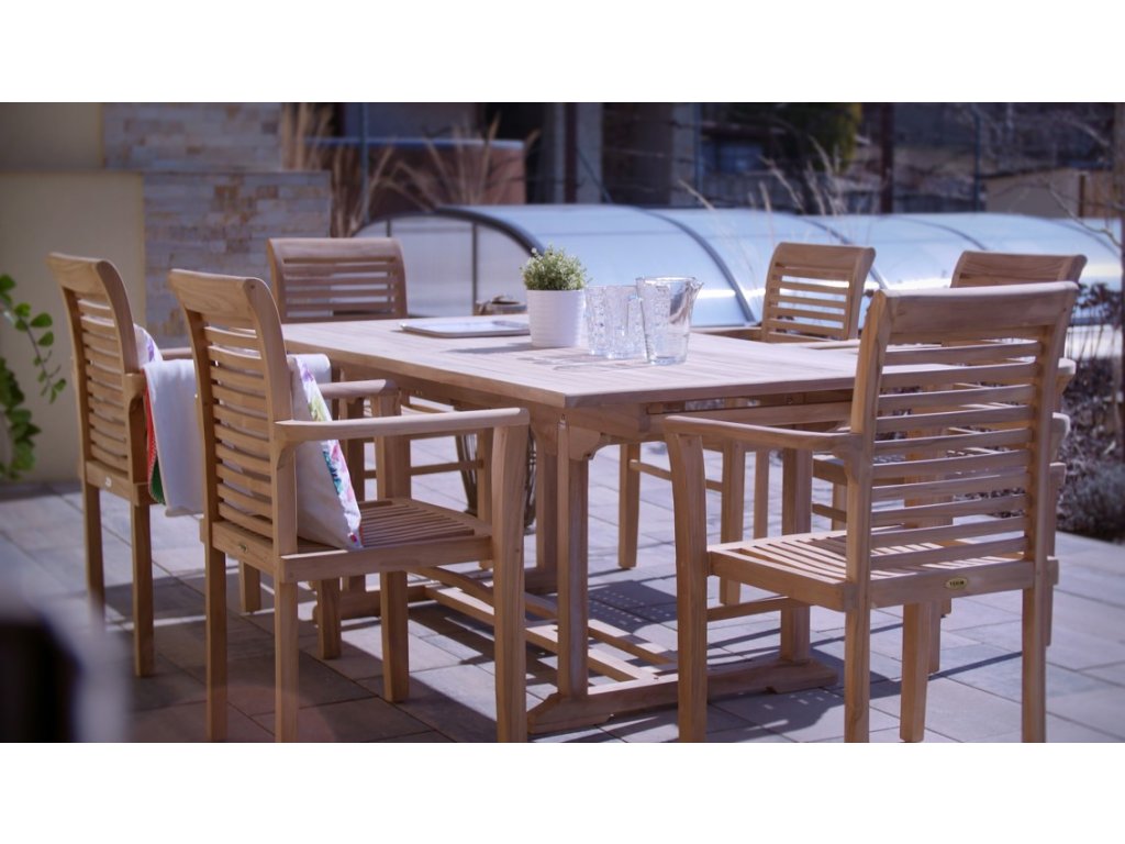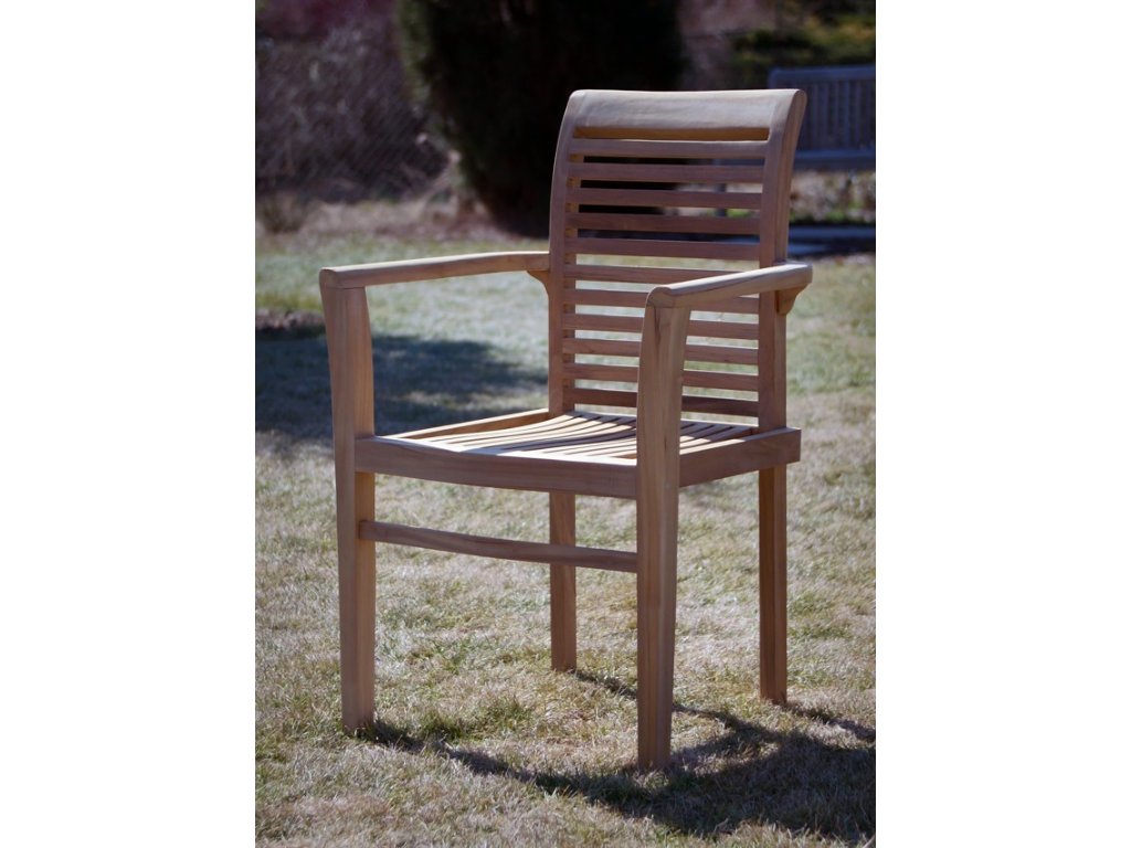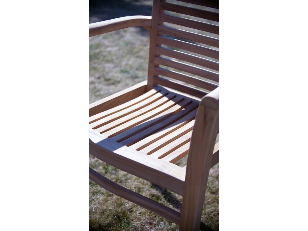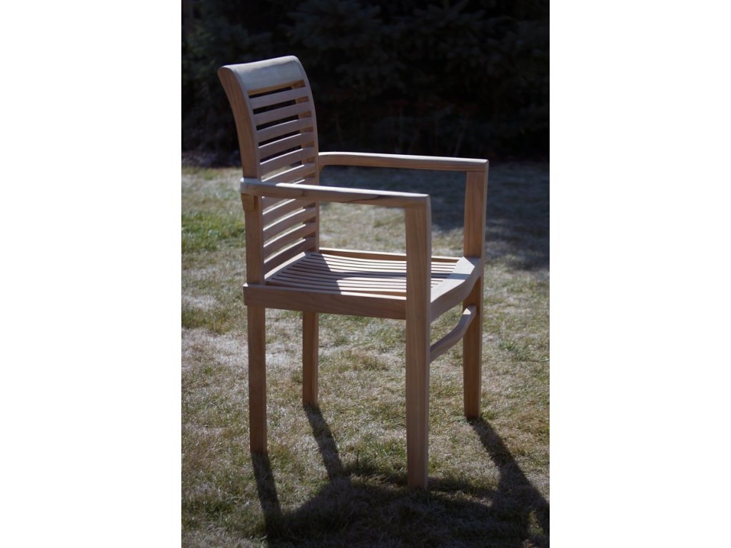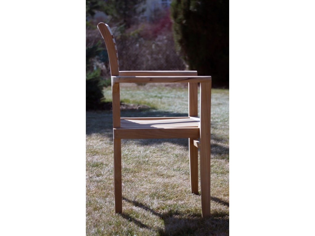 Zahradní stůl doplňuje 6 pevných stohovatelných křesel Stucking s područkami, která jsou rovněž vyrobena z teakového dřeva. Díky použitému materiálu je křeslo velmi pevné a stabilní. Nosnost činí až 130 kg.