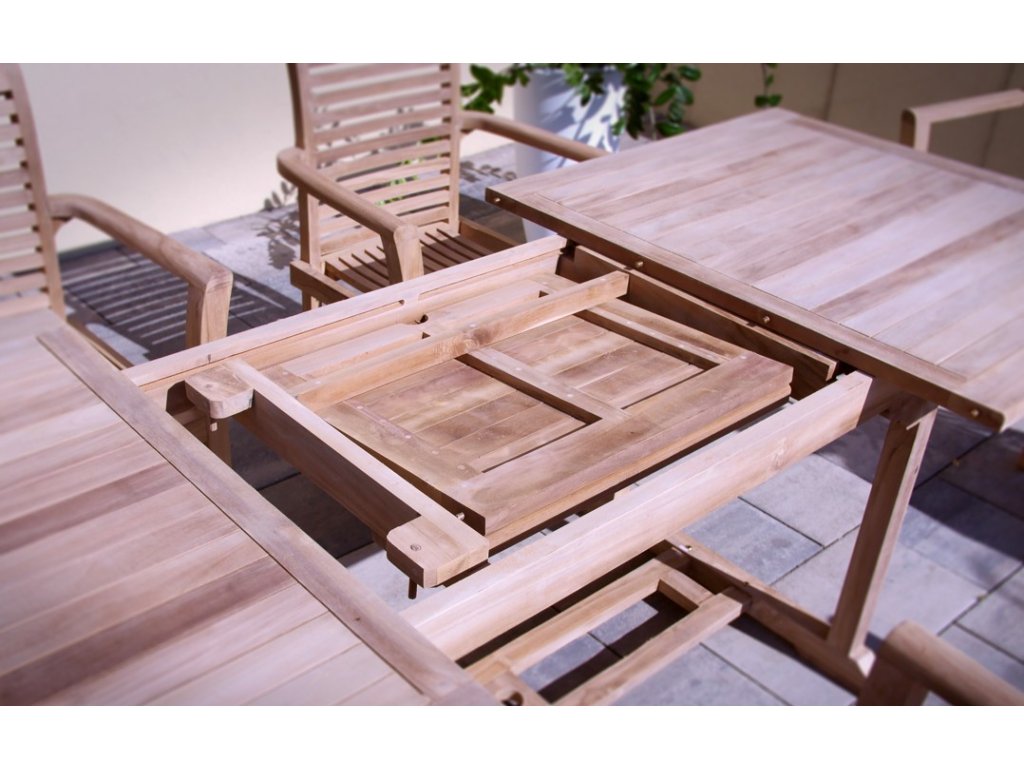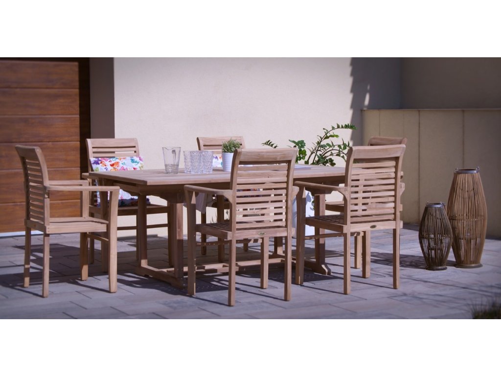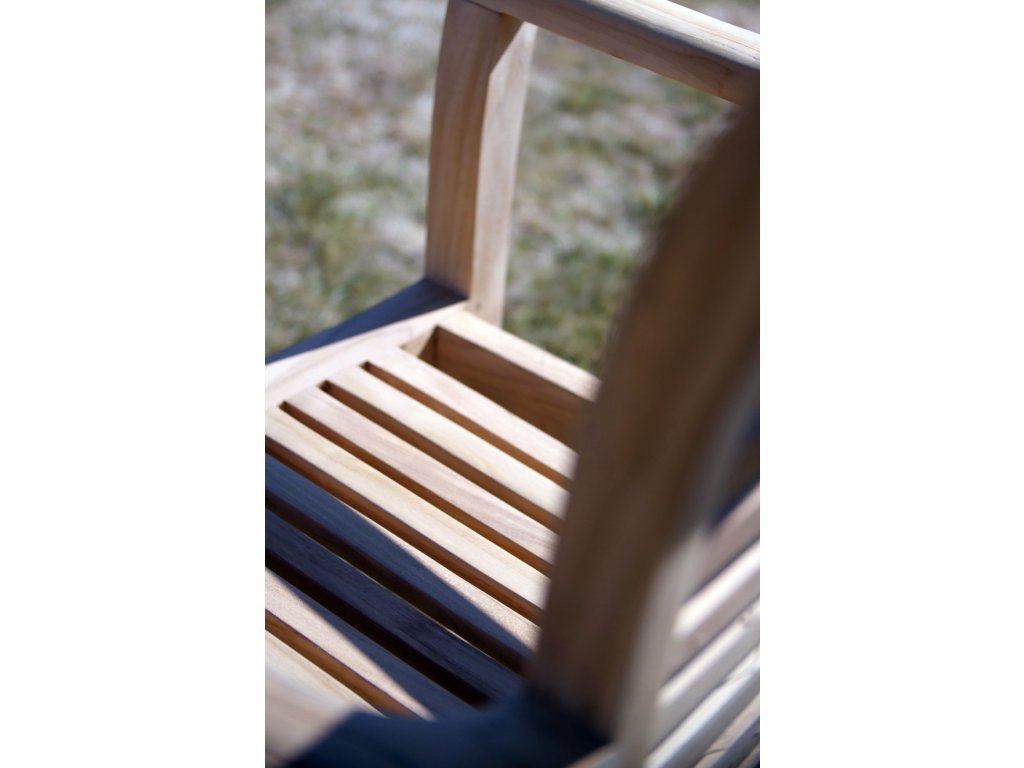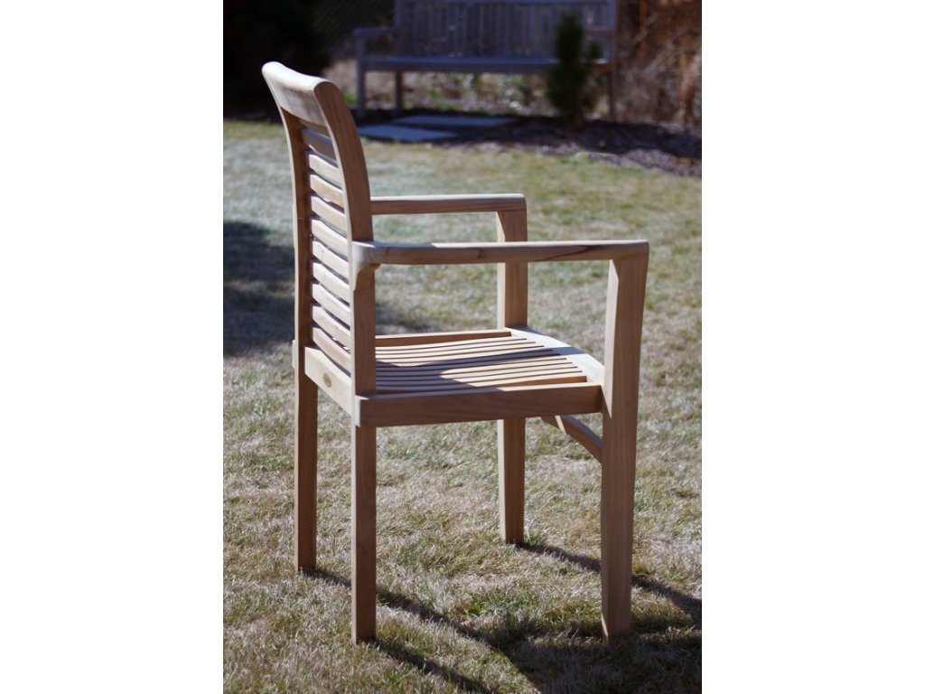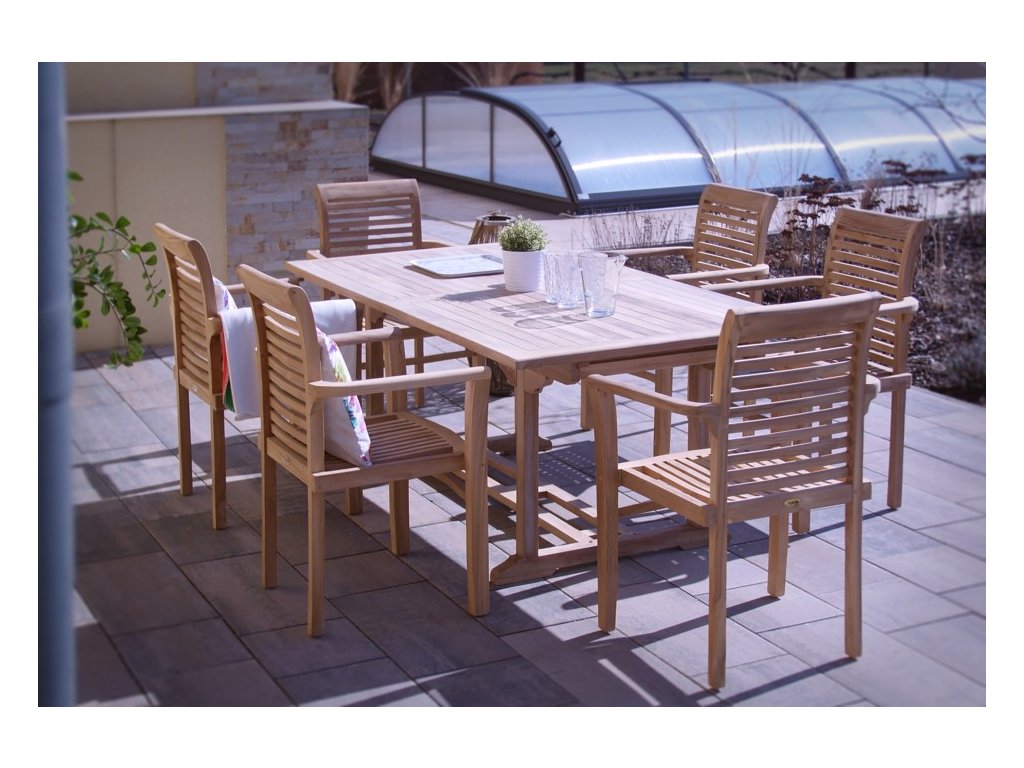 Zahradní stůl doplňuje 6 pevných stohovatelných křesel Stucking s područkami, která jsou rovněž vyrobena z teakového dřeva. Díky použitému materiálu je křeslo velmi pevné a stabilní. Nosnost činí až 130 kg.