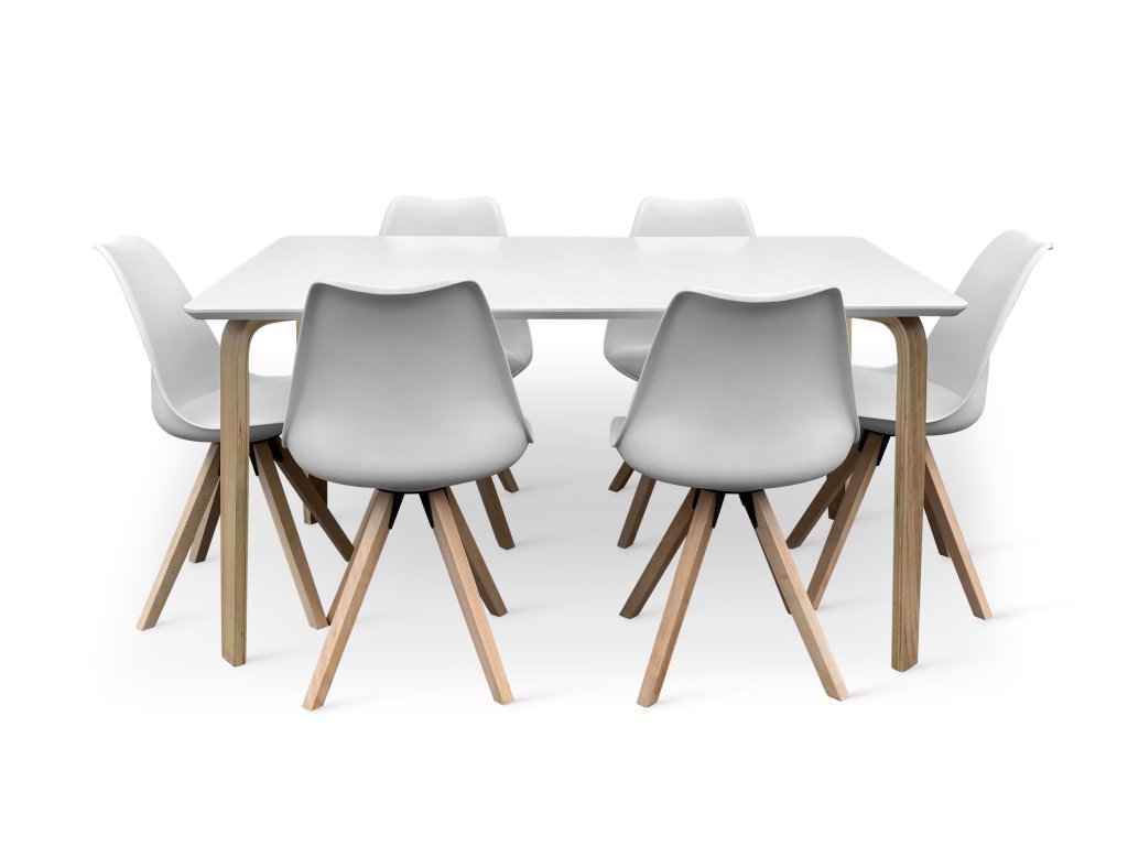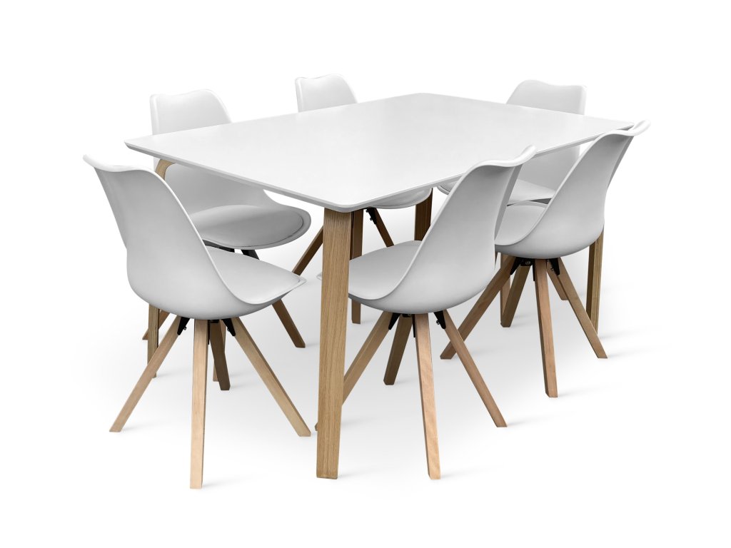 Jídelní set tvoří Dřevěný jídelní stůl Zaha s bílou deskou 150x90 cm a 6x Jídelní židle SCANDINAVIA BEECH bílá.