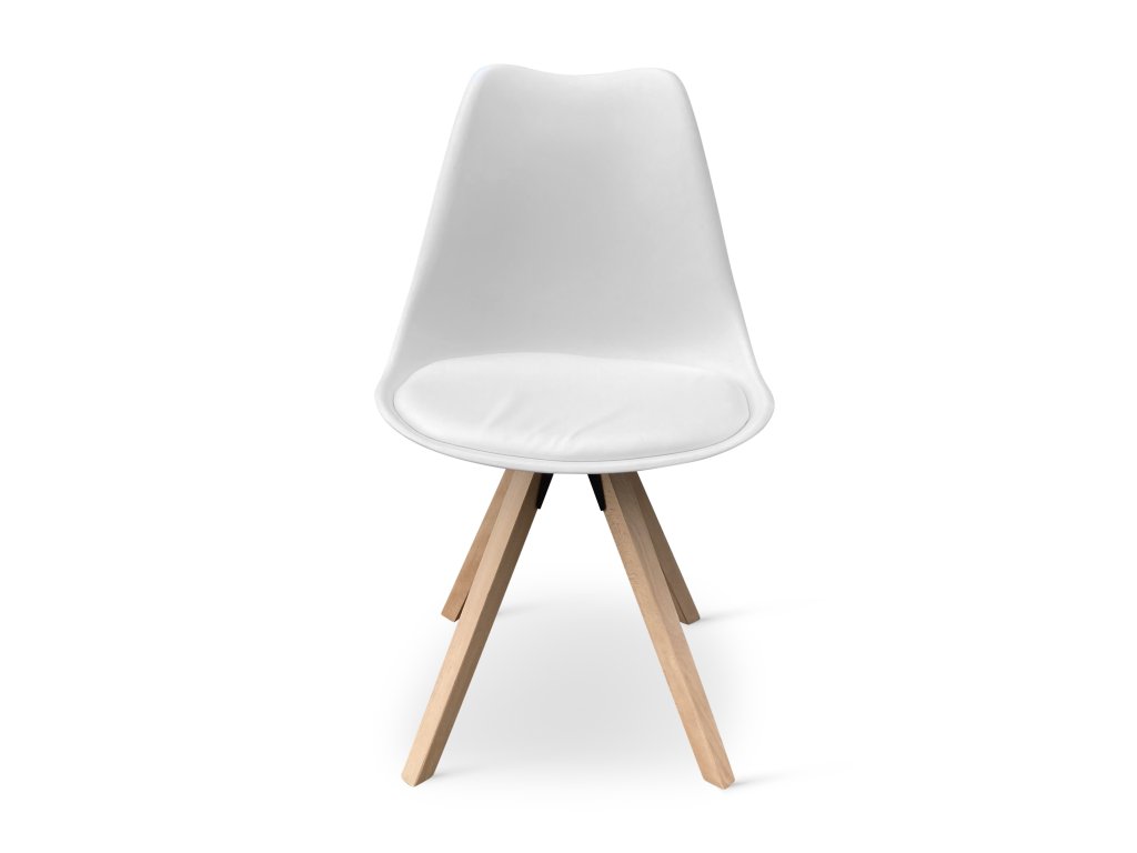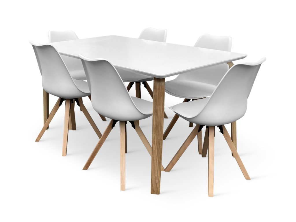 Jídelní stůl doplňuje 6 bílých židlí v jednoduchém skandinávském designu. Sedák a opěrku tvoří odolná plastová skořepina připevněná na 4 nohách z masivního bukového dřeva, které dávají židli patřičnou stabilitu. Pohodlná díky sedáku z eko kůže.