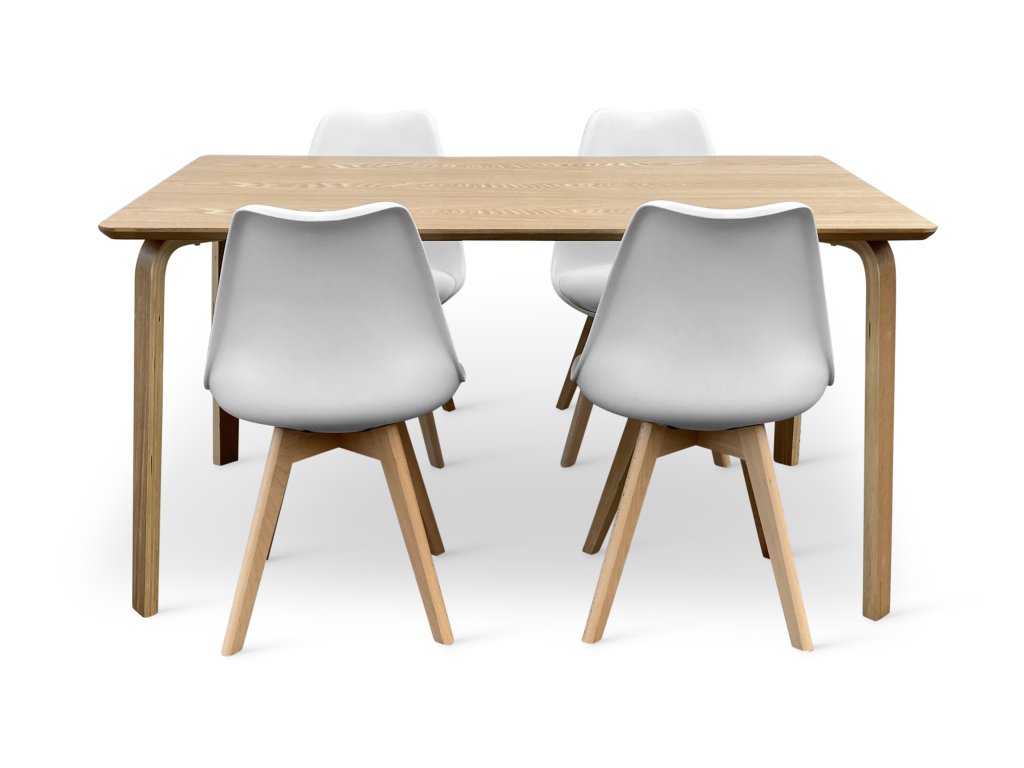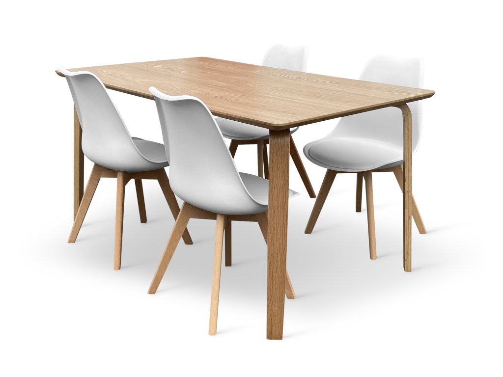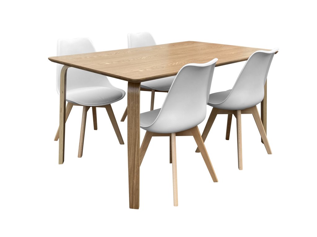 Jídelní set tvoří Dřevěný jídelní stůl Zaha v dekoru dubu 150x90 cm a 4x Jídelní židle SCANDINAVIA.