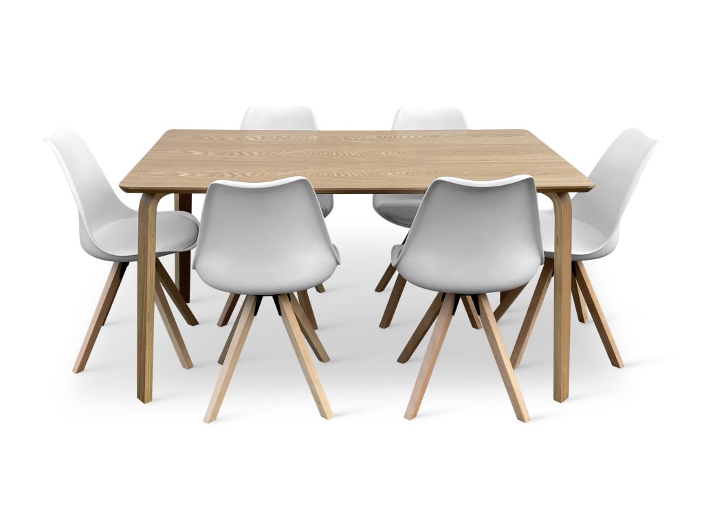 Jídelní set tvoří Dřevěný jídelní stůl Zaha v dekoru dubu 150x90 cm a 6x Jídelní židle SCANDINAVIA BEECH bílá.