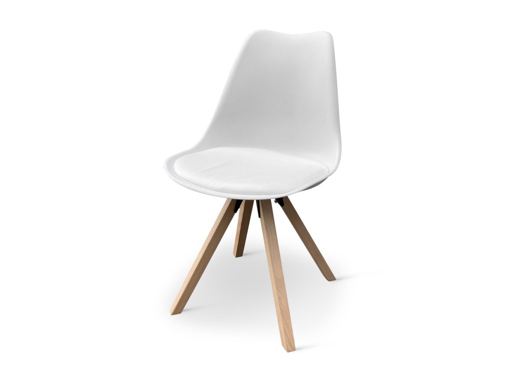 Jídelní stůl doplňuje 6 bílých židlí v jednoduchém skandinávském designu. Sedák a opěrku tvoří odolná plastová skořepina připevněná na 4 nohách z masivního bukového dřeva, které dávají židli patřičnou stabilitu. Pohodlná díky sedáku z eko kůže.