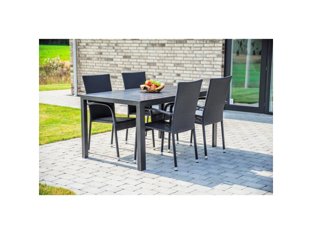 Rádi byste si pořídili na zahradu či terasu praktický jídelní stůl? Obdélníkový stůl VIKING L o rozměrech 90 x 150 cm bude tou správnou volbou! Konstrukce stolu je vyrobena z hliníku ošetřeného proti rzi. Deska stolu z artwoodu v černé barvě věrně imituje strukturu a vzhled dřeva. Výhodou artwoodu, tedy umělého dřeva, je jeho odolnost vůči vnějším vlivům. Stůl můžete celoročně ponechat venku a nemusíte si dělat starosti s jeho úklidem. Ani po několika sezónách neztratí svůj původní vzhled a stabilitu. Díky klasickým tvarům a decentnímu černému provedení stůl VIKING L esteticky zapadne do jakékoliv zahrady či terasy.