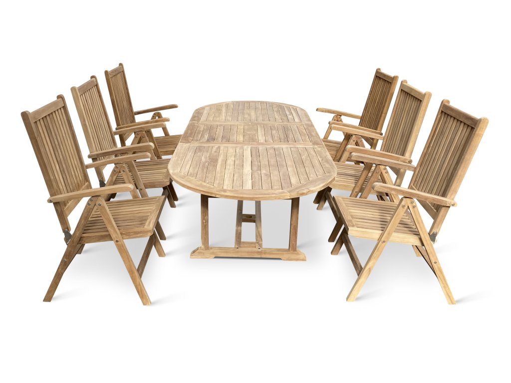 Zahradní rozkládací stůl oválný Faisal a 6 dřevěných skládacích a polohovacích židlí Edy tvoří dohromady opravdu luxusní sestavu nábytku pro Vaši zahradu.