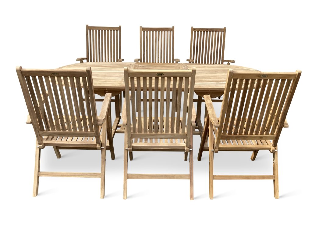 Zahradní stůl doplňuje 6 opravdu pohodlných a stabilních teakových židlí v provedení přírodní teak. Židle má 7 poloh nastavení sklonu opěradla a je velice rychle složená. Po sezóně ji tak snadno uložíte. Široké područky pro pohodlné sezení. Nosnost činí až 130 kg.