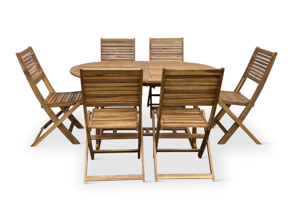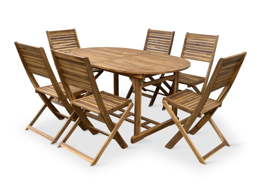 Sestavu tvoří zahradní dřevěný stůl Viet a 6 dřevěných skládacích židlí Mandy.