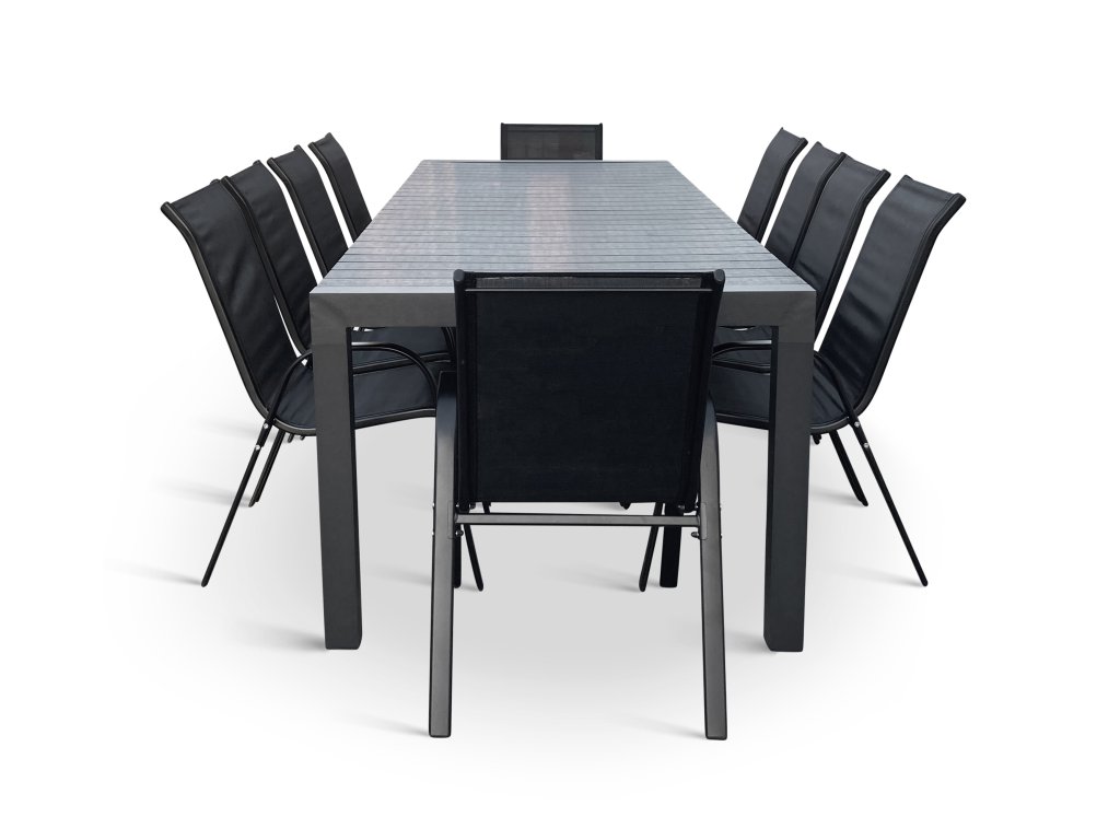 Masivní stůl Grande Pasto XXL je ideálním jídelním stolem vhodným jak do zahrady, tak na terasu. Moderní, atraktivní design, který ještě dlouho nevyjde z módy a jen tak Vás neomrzí. Konstrukce stolu vyrobená z hliníku a adaptéry u nohou zaručují dostatečnou stabilitu a nosnost. Deska stolu v černé barvě je vyrobena z umělého dřeva artwood. Stůl disponuje jednoduchým a praktickým systémem rozkládání. Umělé dřevo oproti tomu přírodnímu skýtá celou řadu výhod. Artwood je odolný vůči dešti, sněhu i prudkému slunci. Nevyšisuje barvu, nepropustí vodu a nenapadnou jej dřevokazní parazité.