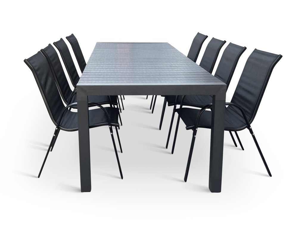 Masivní stůl Grande Pasto XXL je ideálním jídelním stolem vhodným jak do zahrady, tak na terasu. Moderní, atraktivní design, který ještě dlouho nevyjde z módy a jen tak Vás neomrzí. Konstrukce stolu vyrobená z hliníku a adaptéry u nohou zaručují dostatečnou stabilitu a nosnost. Deska stolu v černé barvě je vyrobena z umělého dřeva artwood. Stůl disponuje jednoduchým a praktickým systémem rozkládání. Umělé dřevo oproti tomu přírodnímu skýtá celou řadu výhod. Artwood je odolný vůči dešti, sněhu i prudkému slunci. Nevyšisuje barvu, nepropustí vodu a nenapadnou jej dřevokazní parazité.