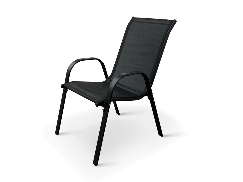 Jídelní stůl doplňuje komfortní zahradní židle s ocelovou konstrukcí. Židle je stohovatelná a bezúdržbová. Sedák a zádovou opěrku tvoří vzdušná textilie a díky inteligentnímu tvarování je velice pohodlná. Židli doplňují kovové područky. Nosnost činí až 130 kg. Vhodná pro nekomerční použití. Pro delší životnost doporučujeme neskladovat ve vlhkých prostorách a nenechávat na dešti.