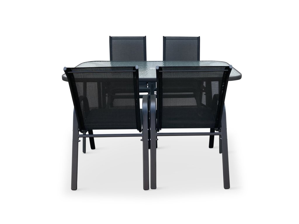 Jídelní stůl doplňuje komfortní zahradní židle s ocelovou konstrukcí. Židle je stohovatelná a bezúdržbová. Sedák a zádovou opěrku tvoří vzdušná textilie a díky inteligentnímu tvarování je velice pohodlná. Židli doplňují kovové područky. Nosnost činí až 130 kg. Vhodná pro nekomerční použití. Pro delší životnost doporučujeme neskladovat ve vlhkých prostorách a nenechávat na dešti.