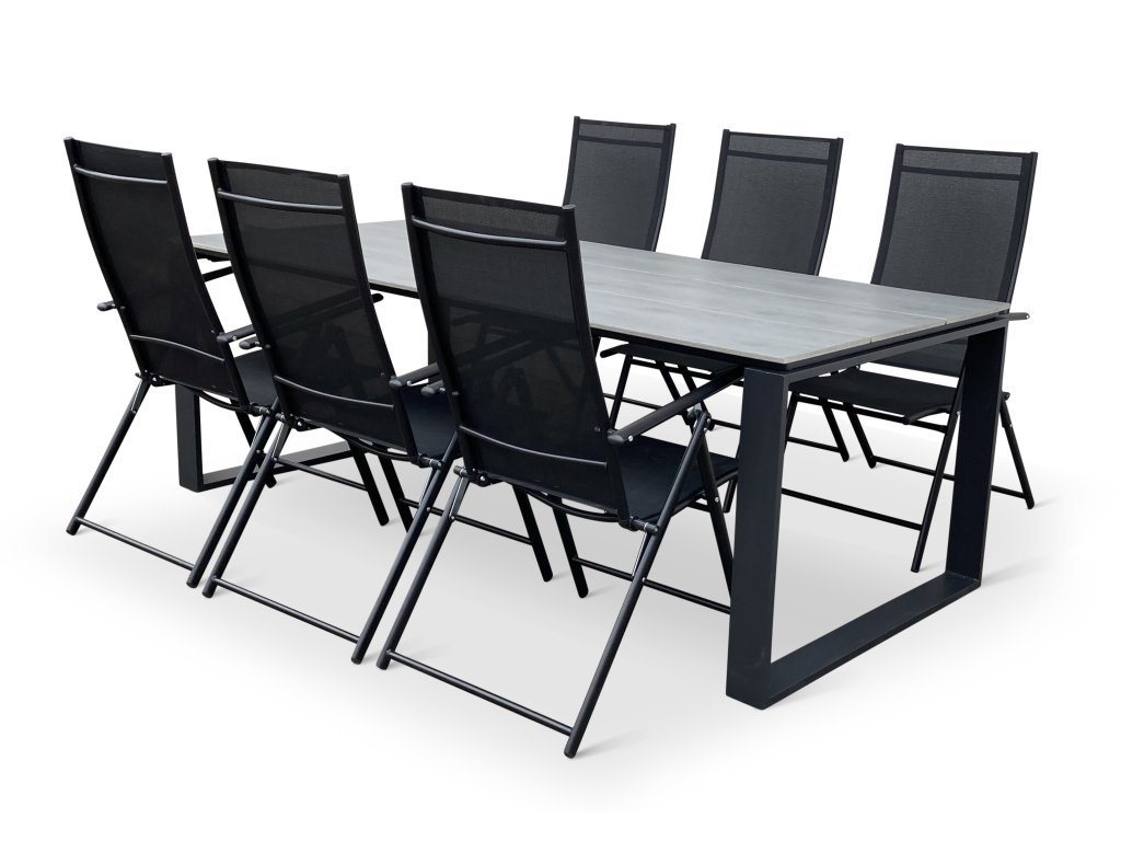 Sestavu tvoří zahradní kovový stůl Strong a 6 polohovacích kovových židlí Pia.