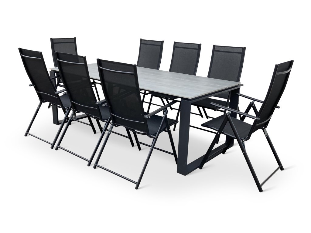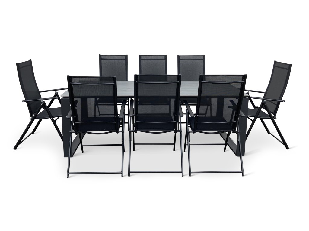 Sestavu tvoří zahradní kovový stůl Strong a 8 polohovacích kovových židlí Pia.