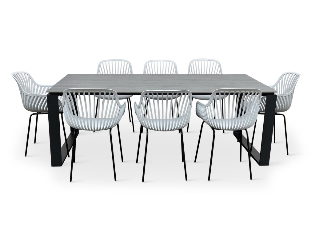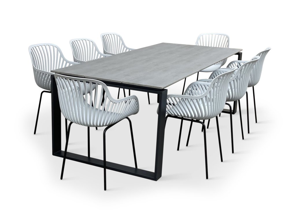 Sestavu tvoří zahradní kovový stůl Strong a 8 designových křesel GABY šedá.