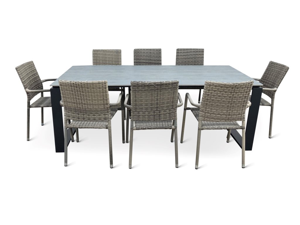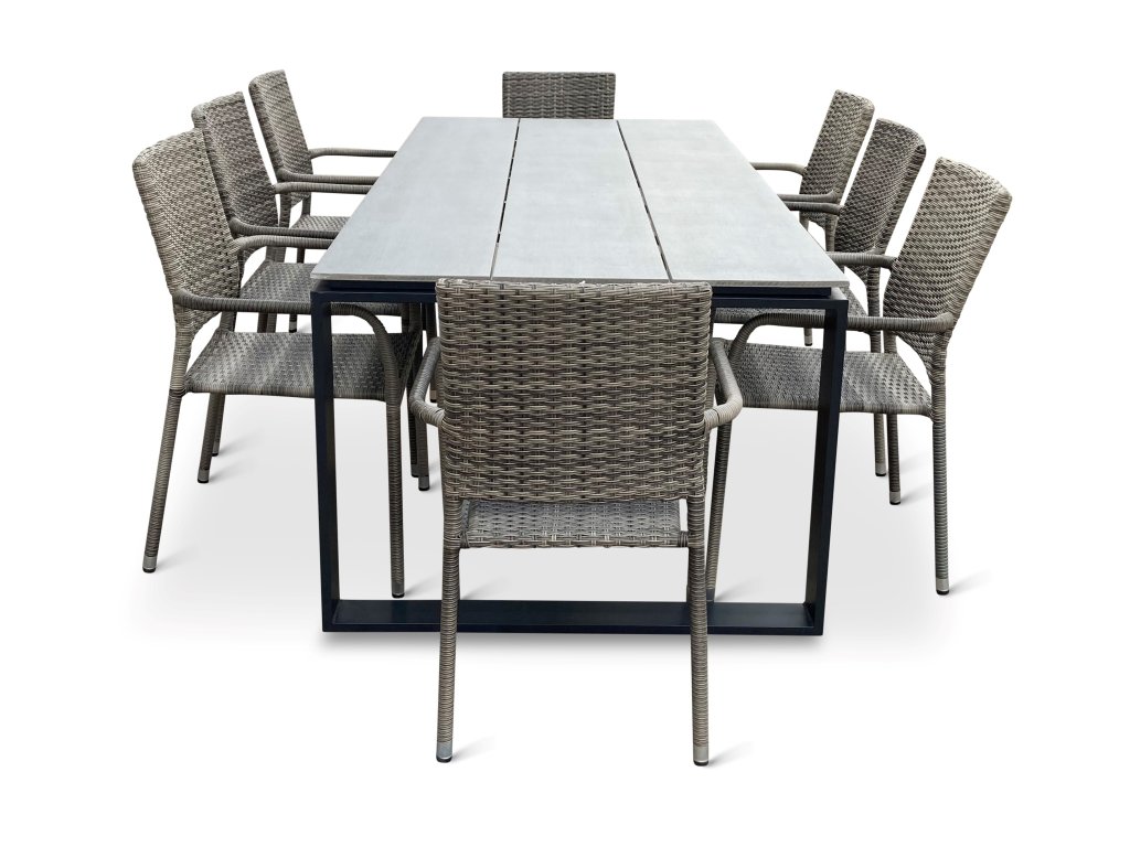 Sestavu tvoří zahradní kovový stůl Strong a 8 zahradních ratanových židlí Pariska.