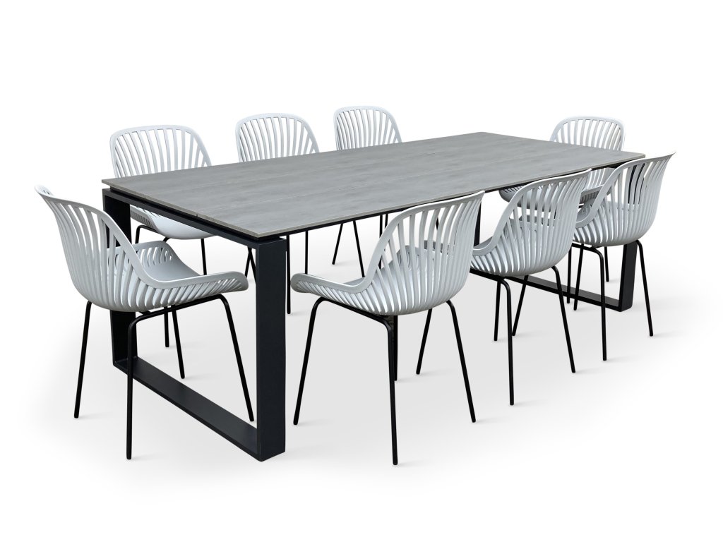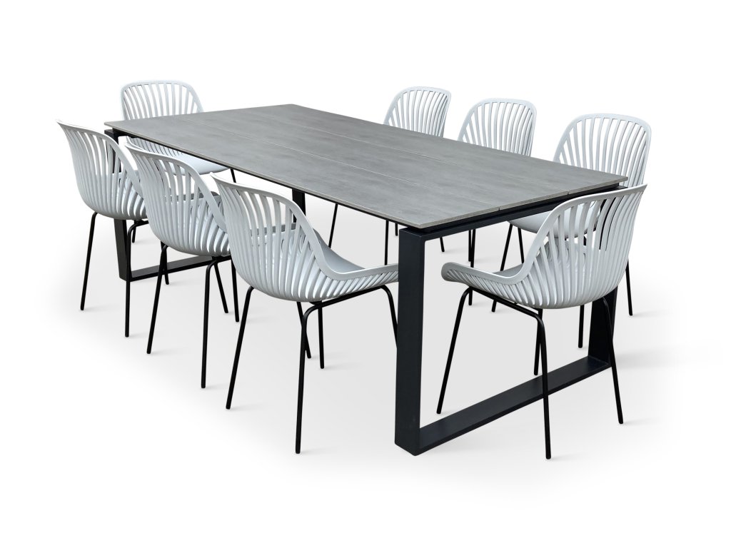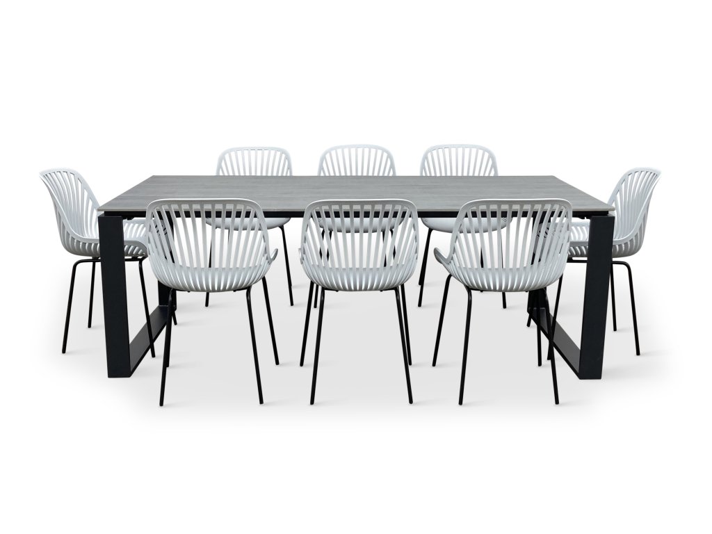 Sestavu tvoří zahradní kovový stůl Strong a 8 designových židlí GABY šedá.