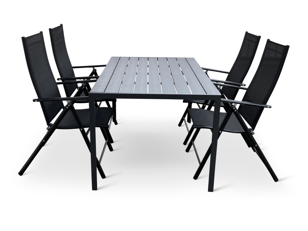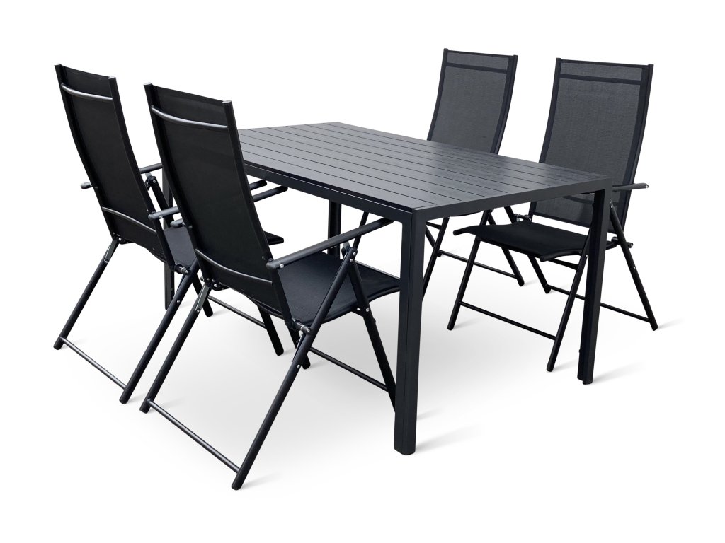 Sestavu tvoří bezúdržbový kovový stůl Viking L a 4 polohovací kovové židle Pia.