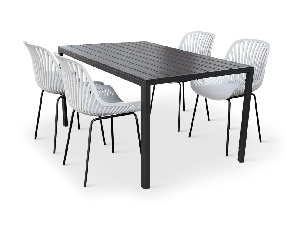 Sestavu tvoří bezúdržbový kovový stůl Viking L a 4 designové židle GABY šedá.