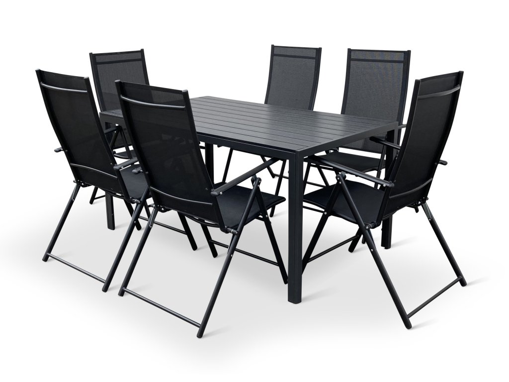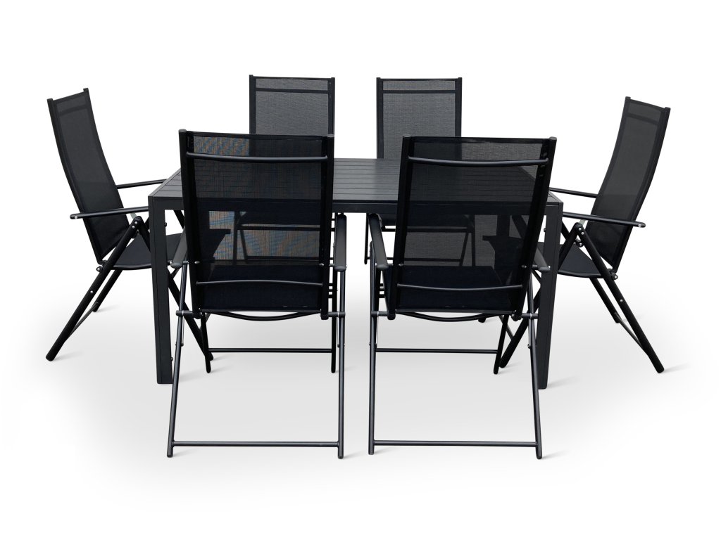 Sestavu tvoří bezúdržbový kovový stůl Viking L a 6 polohovacích kovových židlí Pia.