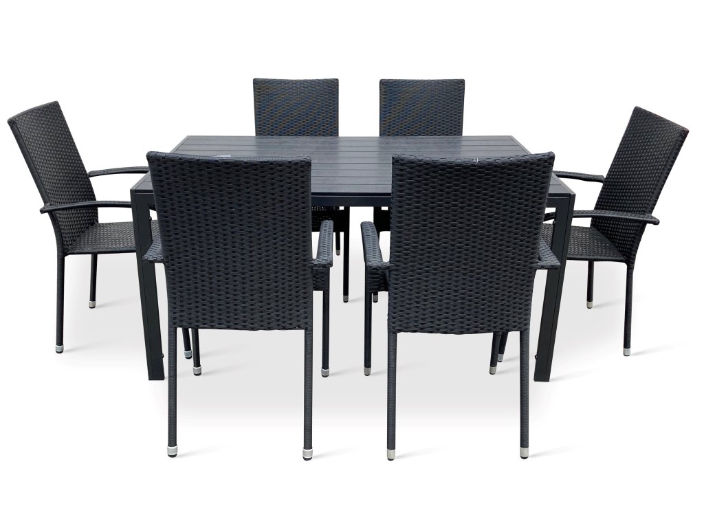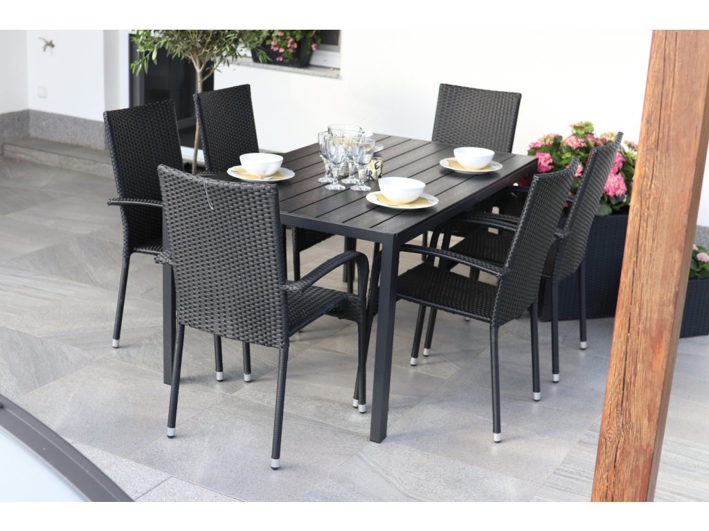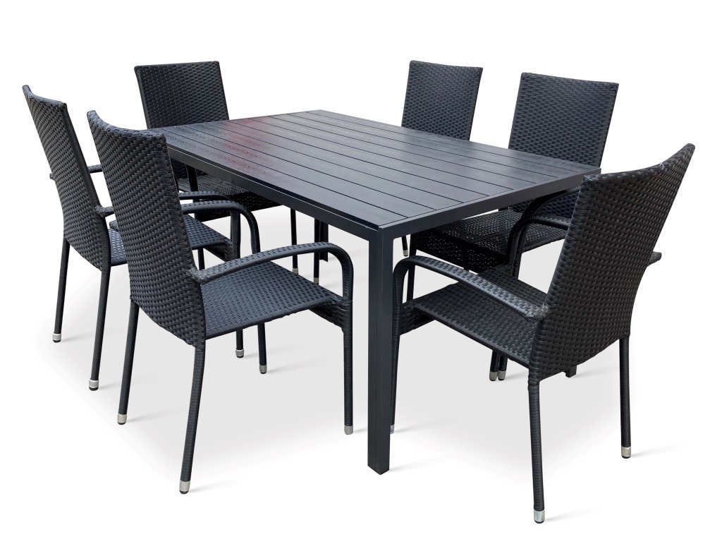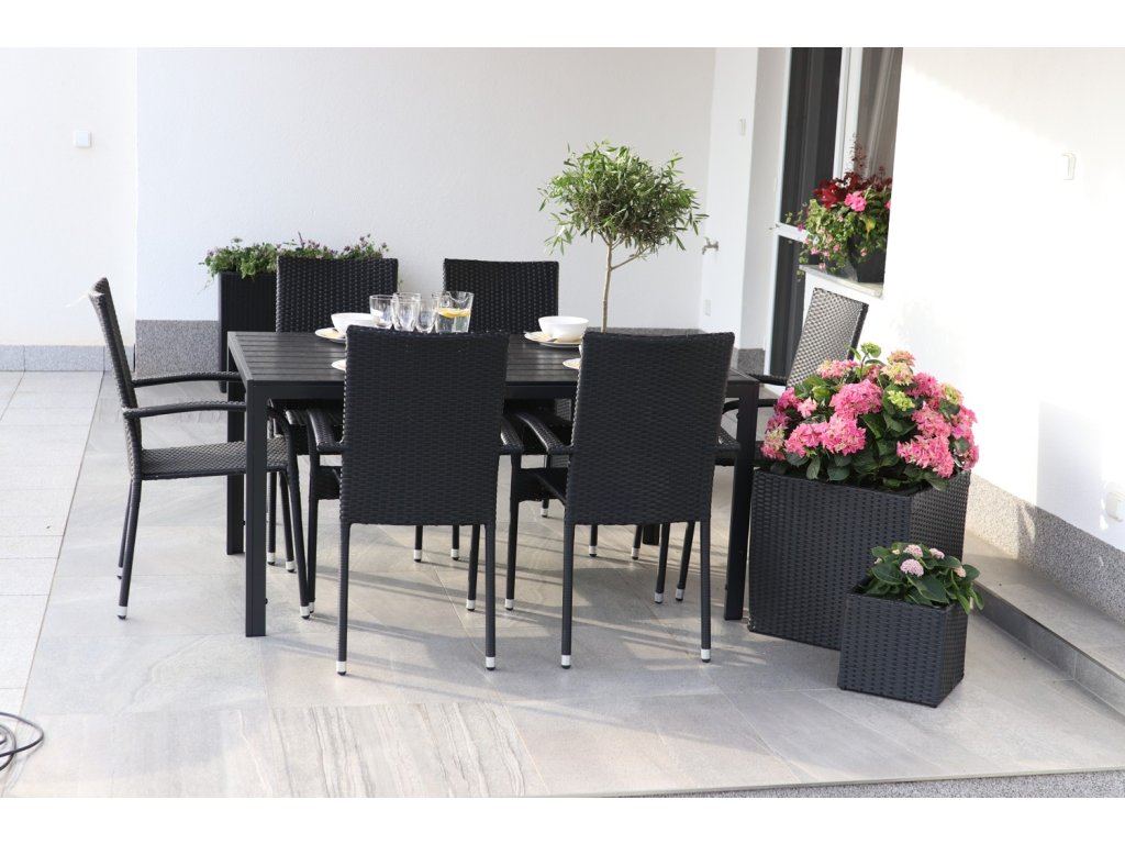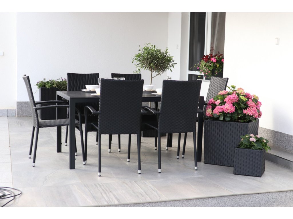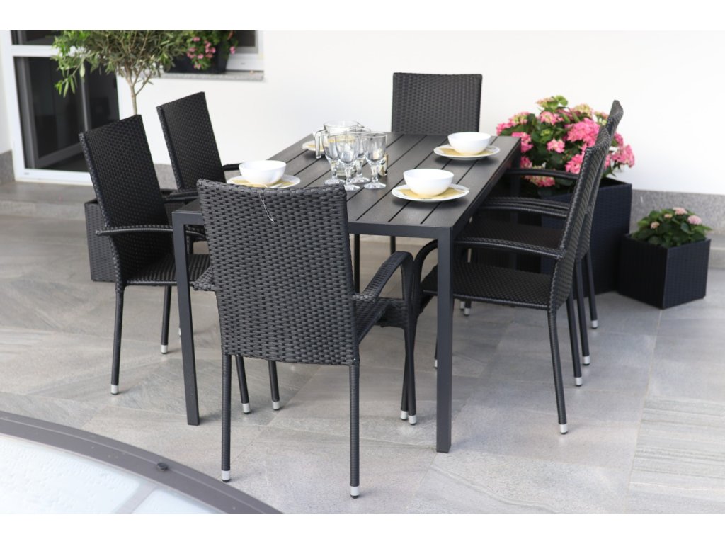 Sestavu tvoří bezúdržbový kovový stůl Viking L a 6 zahradních ratanových židlí Paris.