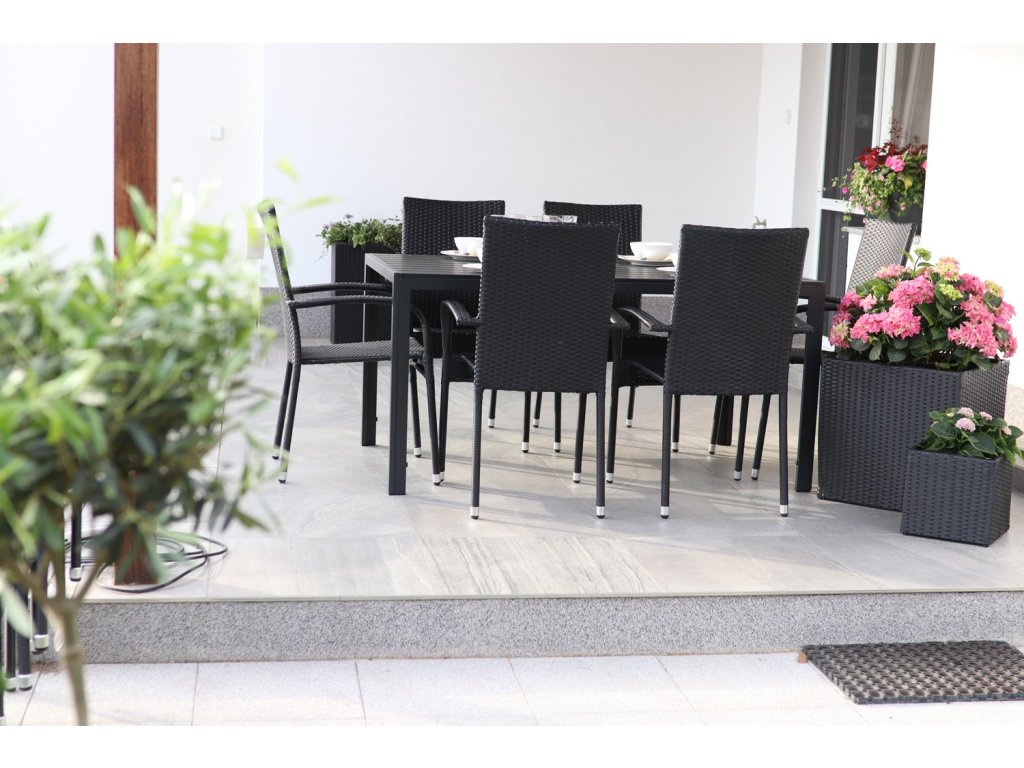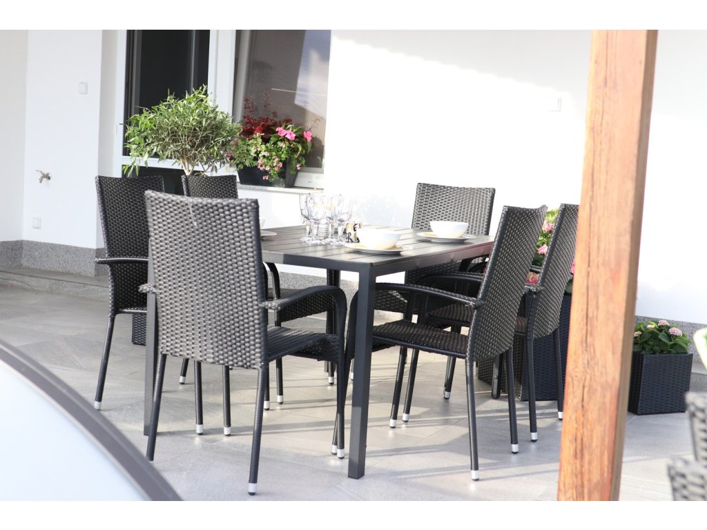 Jídelní stůl doplňuje pohodlná zahradní židle s ocelovou konstrukcí. Židle je stohovatelná, bezúdržbová a má vyztužený sedák, který unese těžší váhy i po delší dobu. Nosnost činí až 130 kg! Židle je vyrobená z umělého ratanu, který je skvělou volbou do českých povětrnostních podmínek. Nevadí mu déšť, mráz, vítr ani slunce.