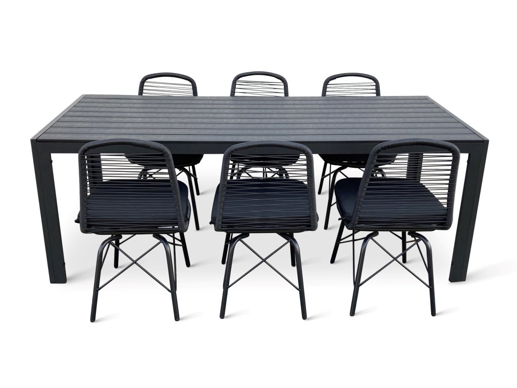 Sestavu tvoří bezúdržbový kovový stůl Viking XL a 6 zahradních židlí z kovu a umělého ratanu Gigi.