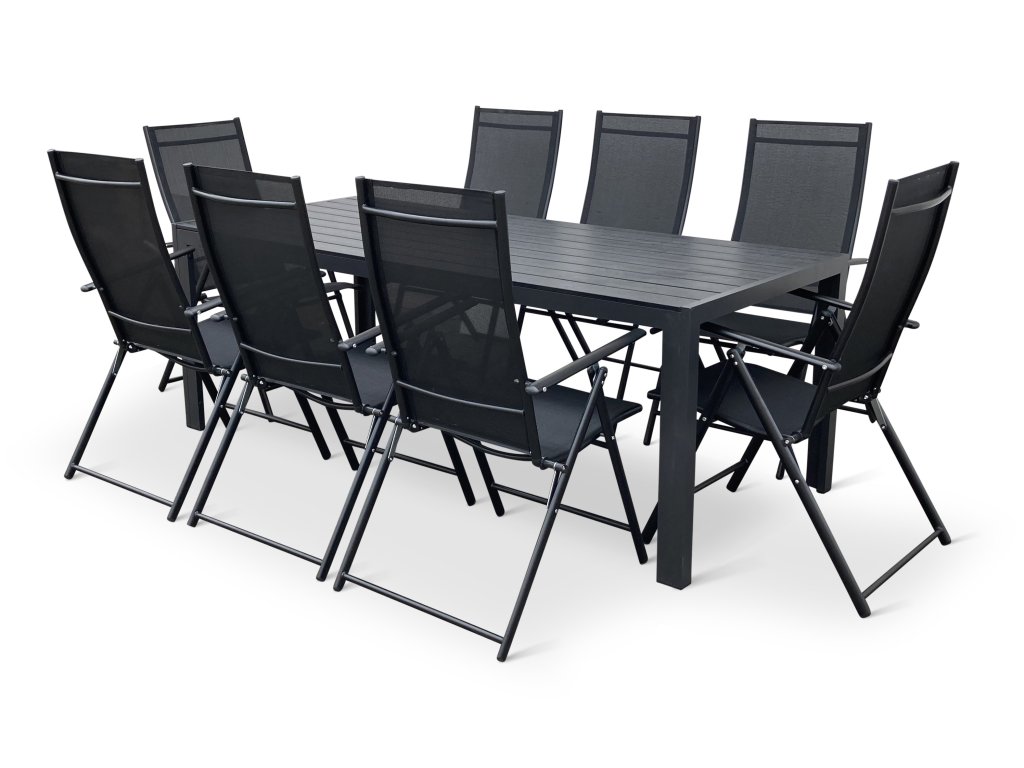 Sestavu tvoří bezúdržbový kovový stůl Viking XL a 8 polohovacích kovových židlí Pia.