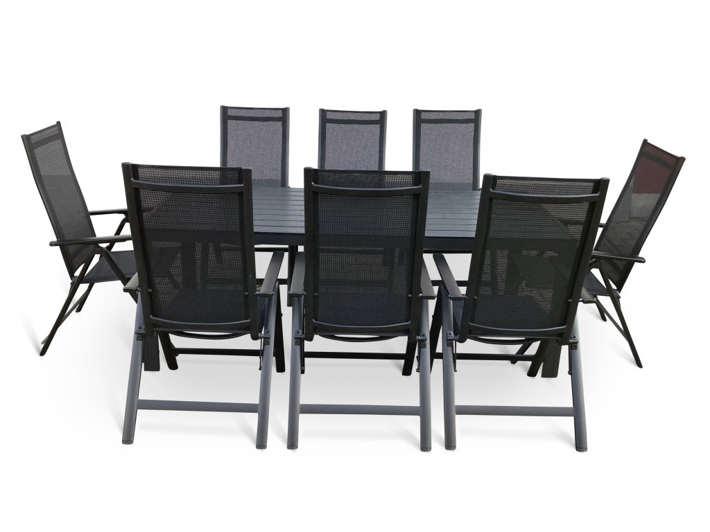 Sestavu tvoří bezúdržbový kovový stůl Viking XL a 8 zahradních polohovacích židlí Tony.