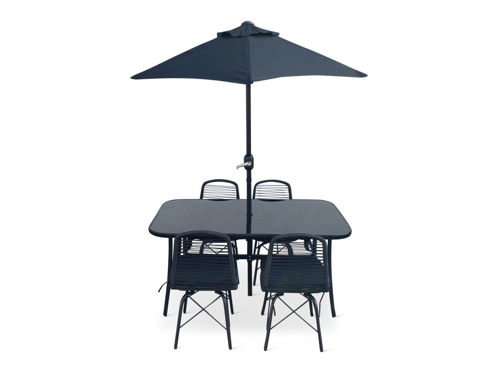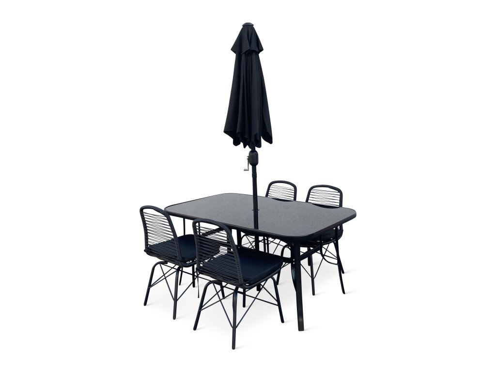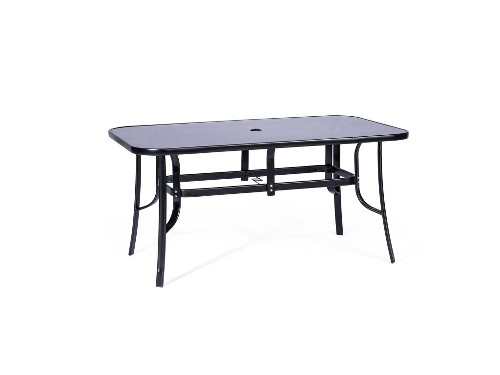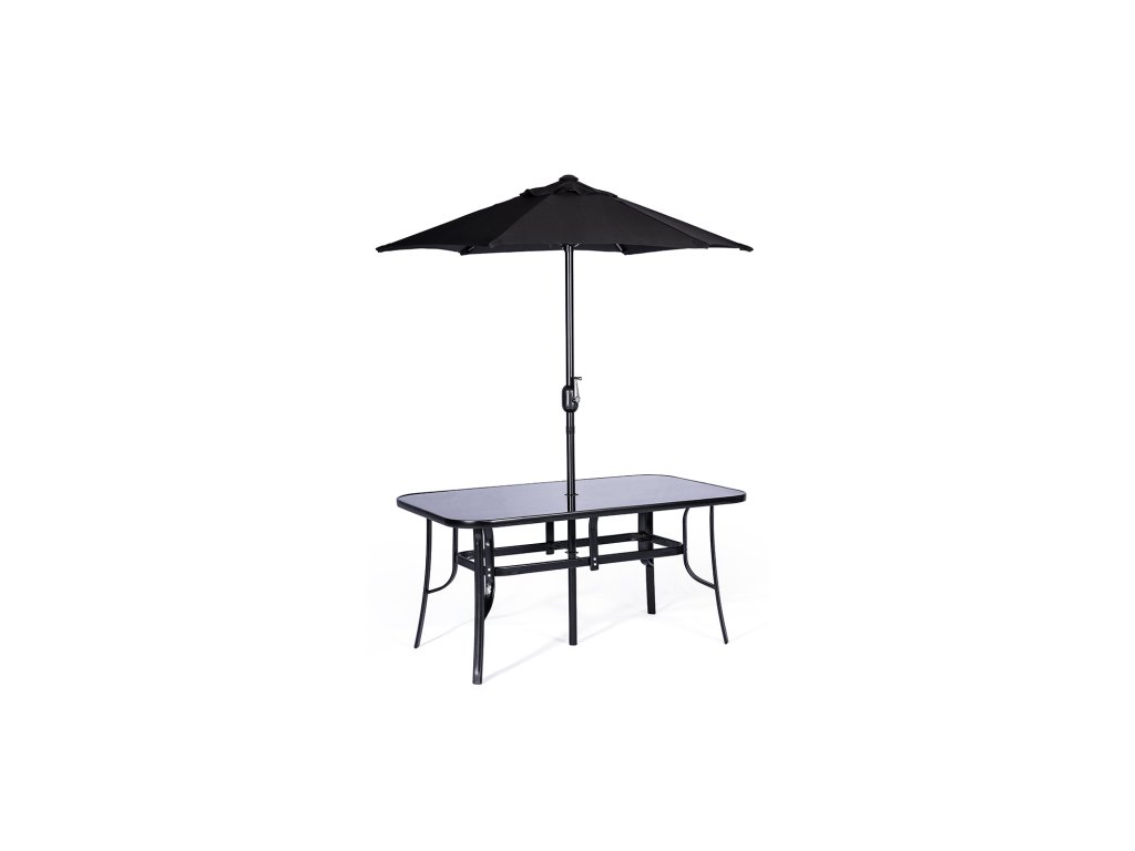 Stůl, jehož deska je vyrobena z temperovaného skla v černé barvě, krásně ladí s celým setem a dodává mu na eleganci. Stůl je široký 90 cm a dlouhý 150 cm. Nabízí dostatek místa pro 4-6 židlí. Praktickým detailem stolu je otvor na slunečník ve středu desky. Slunečník můžete kdykoliv jednoduše vyndat a plachtu stáhnout pomocí otočné kličky. Díky volitelnosti slunečníku je set vhodný jak pro ty, kteří si rádi užívají přímého slunce, tak pro ty, kteří preferují stín. Průměr slunečníku je 1,8 m.