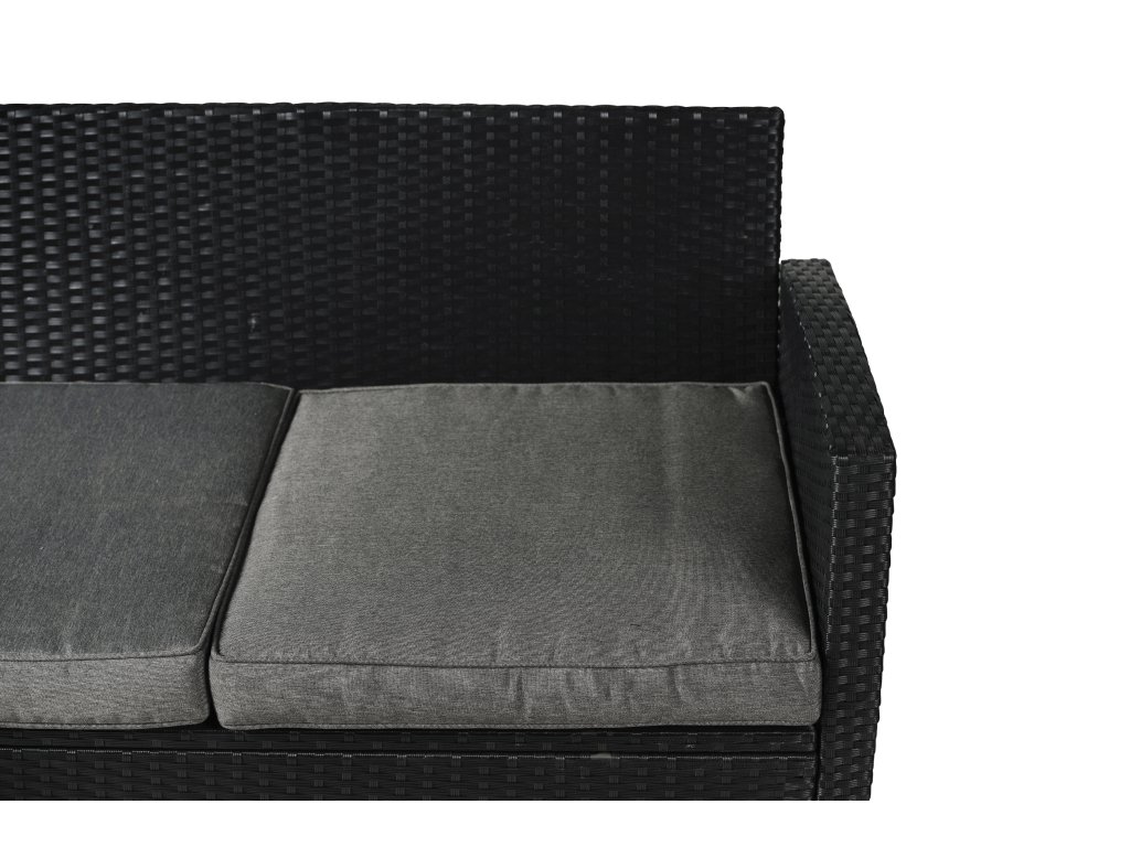 Pohodlná sedací souprava FAMILY GRANDE antracit v černé barvě nabídne nejen precizní provedení, ale i kvalitní a spolehlivé zpracování. Její konstrukce je vyrobena z pevné a odolné oceli ošetřené metodou práškového lakování, jež zajistí odolnost proti rzi na dlouhé roky. Konstrukce je vypletena umělým ratanem. Umělý ratan je moderní syntetický materiál, často používaný na výrobu zahradního nábytku. Dobře snáší jakékoli povětrnostní podmínky. Přímé letní slunce, prudký déšť, mráz, vítr… Umělý ratan nevyšisuje barvu, nepopraská, neztratí pevnost, a to ani po letech užívání. Další jeho nespornou výhodou oproti přírodnímu ratanu jsou nulové nároky na údržbu. K jeho údržbě Vám bohatě postačí vlhký hadřík. Součástí sestavy jsou i polštáře a podsedáky. Podsedáky jsou opatřeny snímatelnými potahy z vysoce kvalitního polyesteru, který je odolný vůči mírnému dešti. Atraktivní vzhled nábytku umocní elegantní deska stolu, která je vyrobena z černého temperovaného skla.
