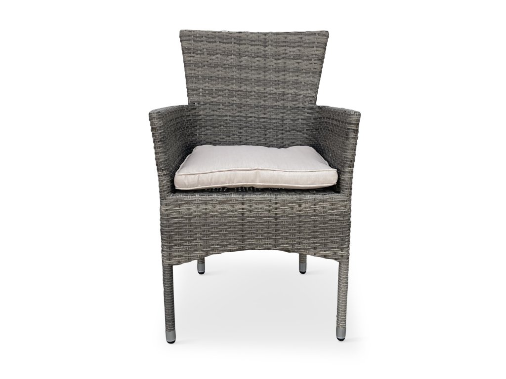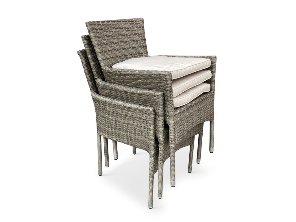 Jídelní stůl doplňují 2 pohodlná zahradní křesla s vysoce kvalitní ocelovou konstrukcí. Křeslo je stohovatelné, bezúdržbové a je dodáváno včetně podsedáku. Nosnost činí až 130 kg! Křeslo je vyrobené z umělého ratanu.