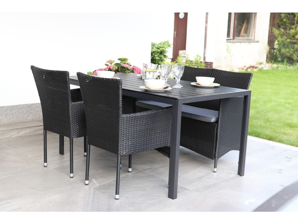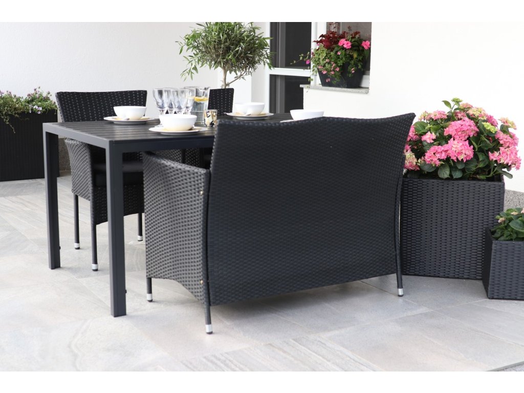 Sestavu tvoří bezúdržbový kovový stůl Viking L, zahradní ratanová lavice Bali a 2 zahradní ratanová křesla Bali.