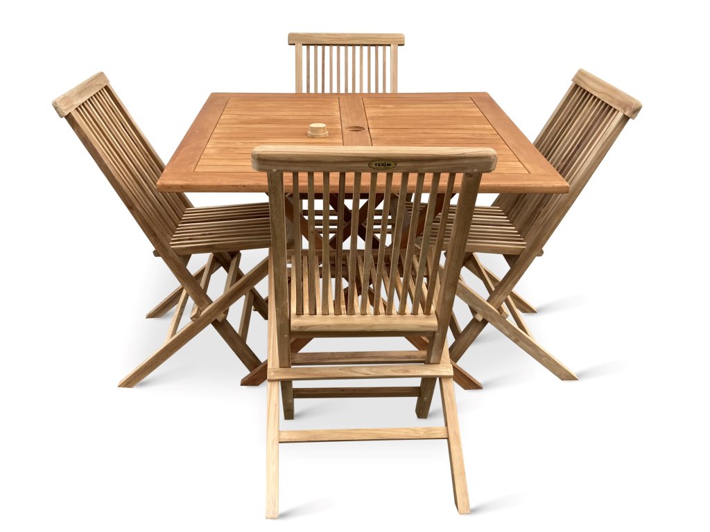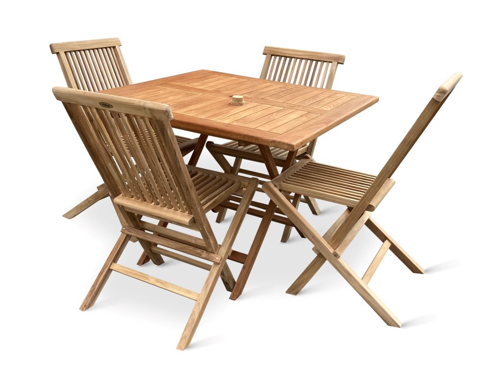 Teakovou sestavu Square II. tvoří zahradní skládací stůl Roger II. a 4 dřevěné teakové skládací židle Clasic.