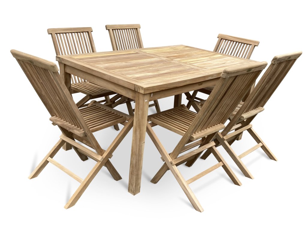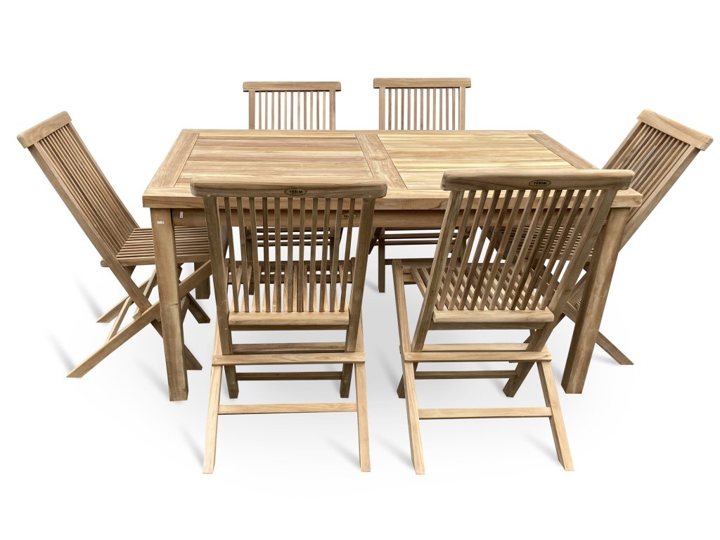 Zahradní stůl doplňuje 6 skládacích teakových židlí v provedení přírodní teak. Jednoduchý design židle bez područek. Díky možnosti složení židle nezabere mnoho místa při uskladnění. Nosnost činí až 110 kg.