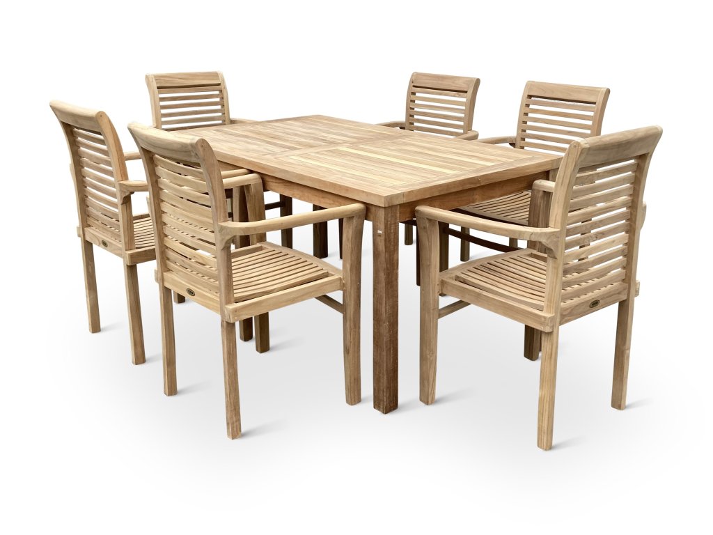 Zahradní stůl doplňuje 6 pevných stohovatelných křesel Stucking s područkami, která jsou rovněž vyrobena z teakového dřeva. Díky použitému materiálu je křeslo velmi pevné a stabilní. Nosnost činí až 130 kg.