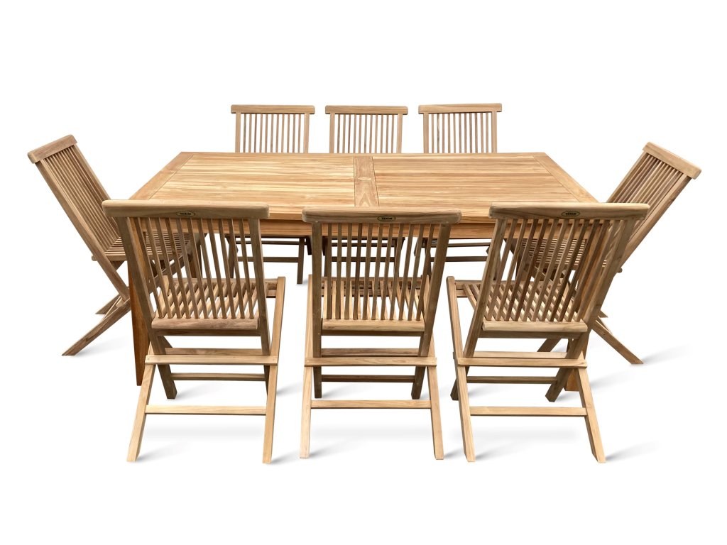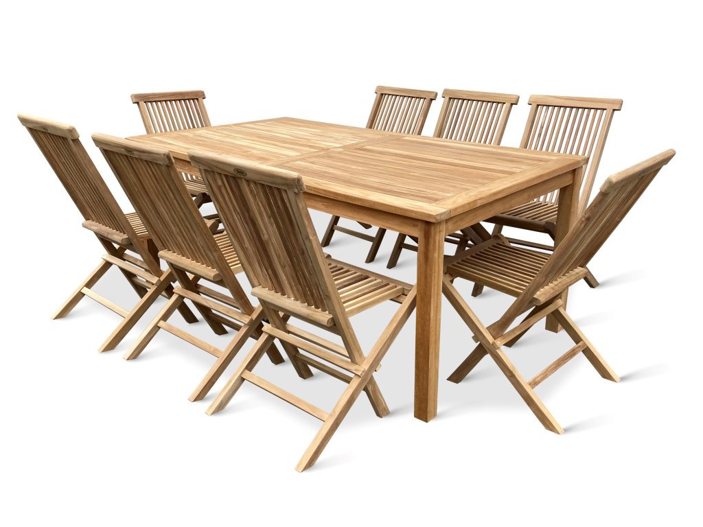Zahradní stůl doplňuje 8 skládacích teakových židlí v provedení teak natural. Jednoduchý design židle bez područek. Díky možnosti složení židle nezabere mnoho místa při uskladnění. Nosnost činí až 110 kg.
